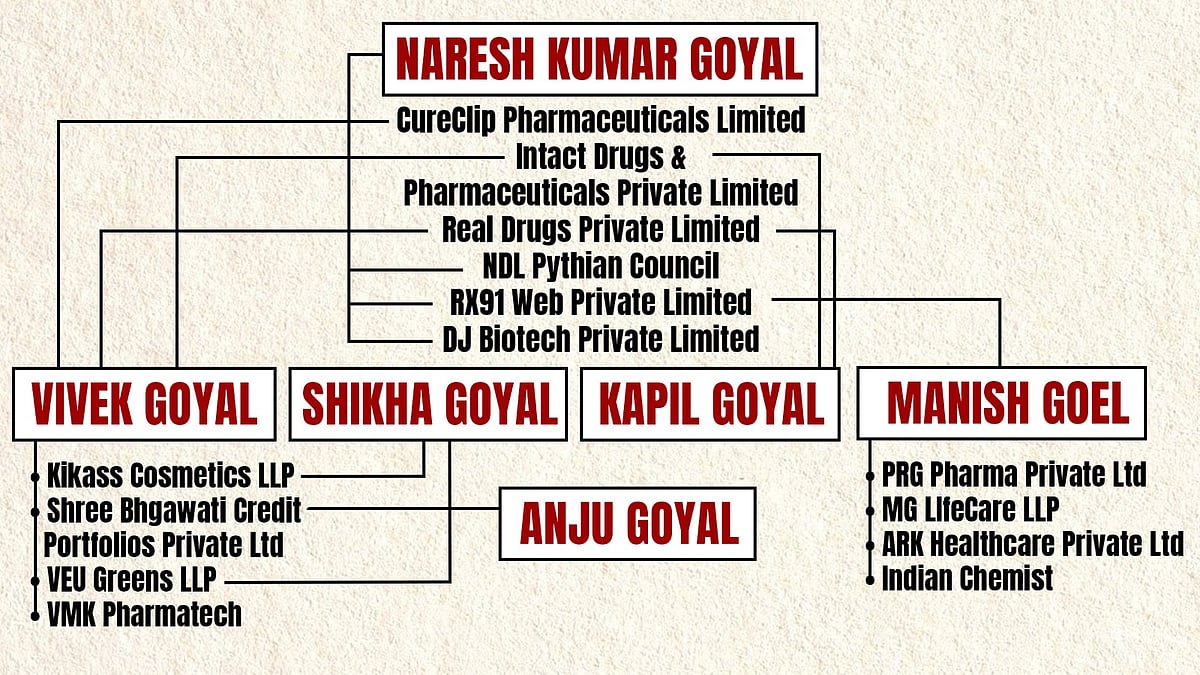 Additional names in the network include Naresh’s third son Kapil Goyal, who is a director of both Real Drugs and Intact. There is also his second son Manish Goel, who is a director of RX91 Web Private Limited, MG LIfecare LLP, Metallurgy Research LLP, as well as two more pharmaceutical companies called ARK Health Care Private Limited and PRG Pharma Private Limited. Shikha Goyal is also a director of Kikass, and was a director of Veu Greens in the past. Anju Goyal serves as the director of Shree Bhagwati.