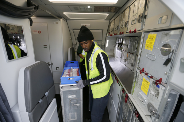 Now, cleanup crew must make way for Mike O'Connell and his two workers from the catering company, Gate Gourmet, who enter the plane from the back of the cabin. The catering workers roll carts, filled with prepackaged meals, down the narrow aisles, trying to avoid the cabin cleaners.