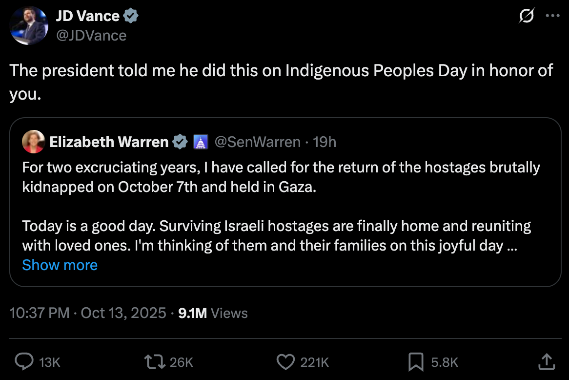 “For two excruciating years, I have called for the return of the hostages brutally kidnapped on October 7th and held in Gaza,” Warren wrote. “Today is a good day.
