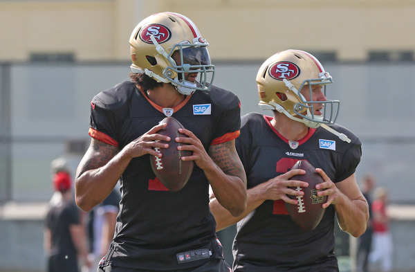 Quarterback Colin Kaepernick was booed as San Francisco's offense took the field on its first drive. But it wasn't clear whether he was booed for kneeling during the national anthem, which he's done since the preseason or for wearing a T-shirt with Fidel Castro and Malcolm X on it weeks ago during a postgame interview.