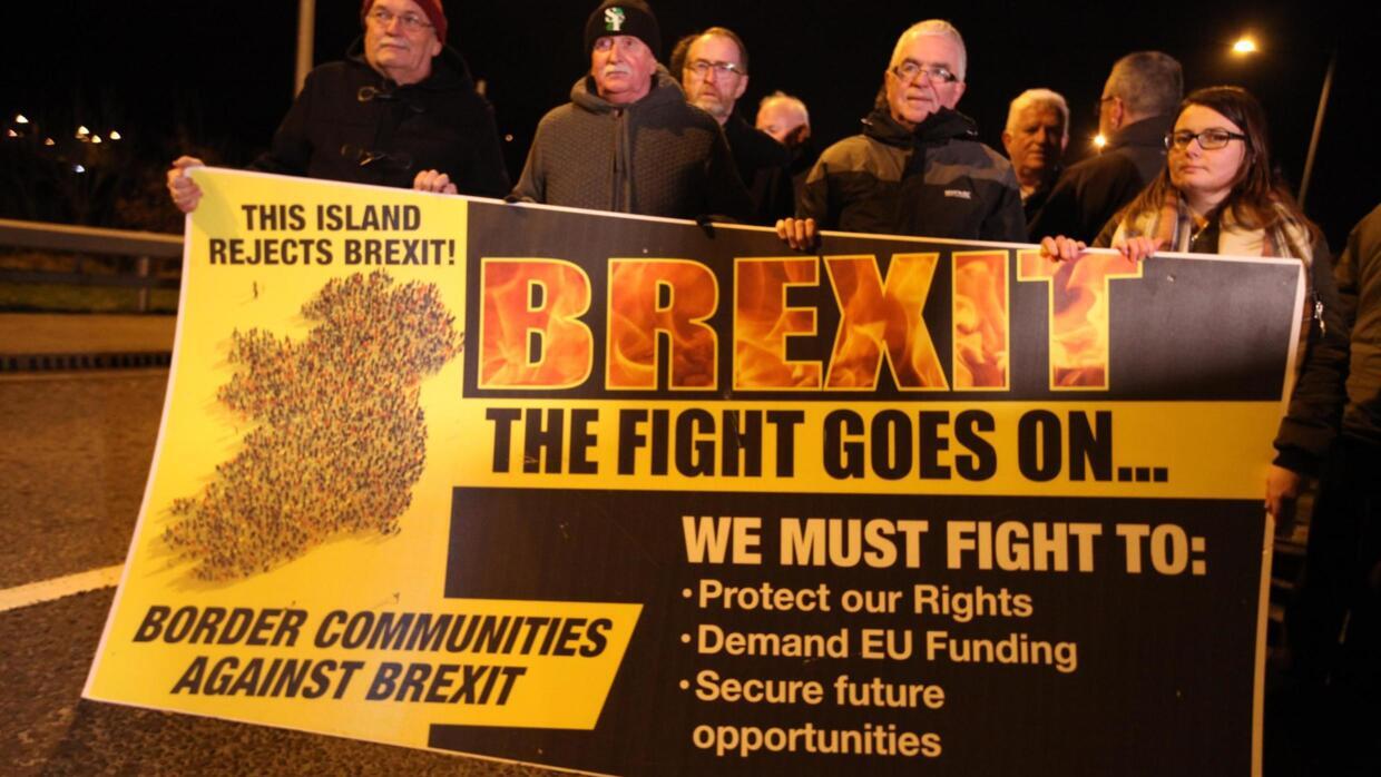 Some are holding posters saying: “No Border in Ireland,” “56 Percent in the North Voted Remain” and a large, printed one with the word “Brexit” in flames, saying that “the fight goes on.”