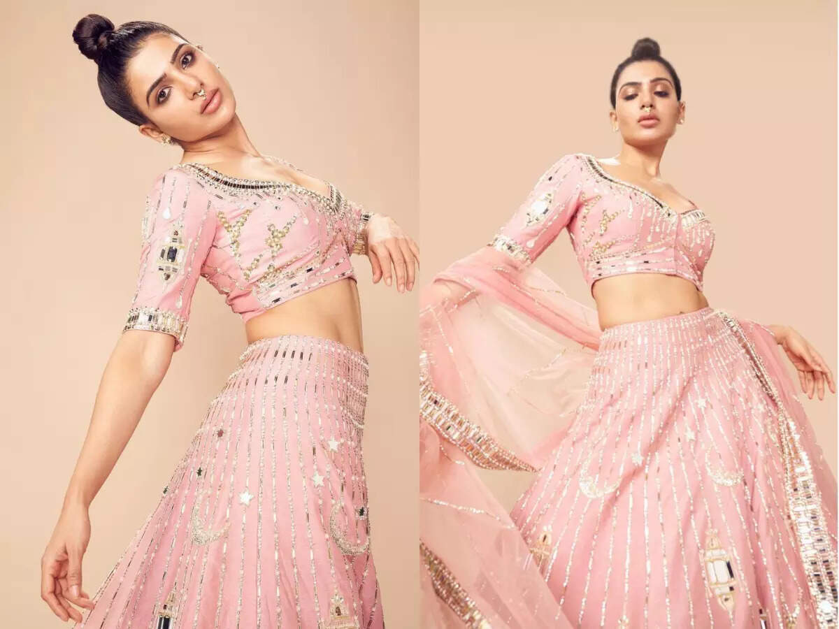 Samantha stunned in a pink lehenga by Neeta Lulla. The plush punk lehenga featured a stellar saga of crystal, mirror-work, Swarovski details and wondrous natural motifs on a pastel silhouette.