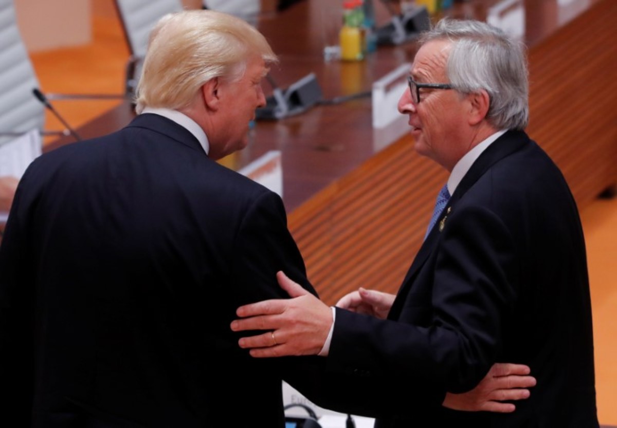 U.S. President Donald Trump talks with European Commission President Jean-Claude Juncker during a working session at the G20 leaders summit in Hamburg, Germany July 8, 2017. REUTERS/Wolfgang Rattay
