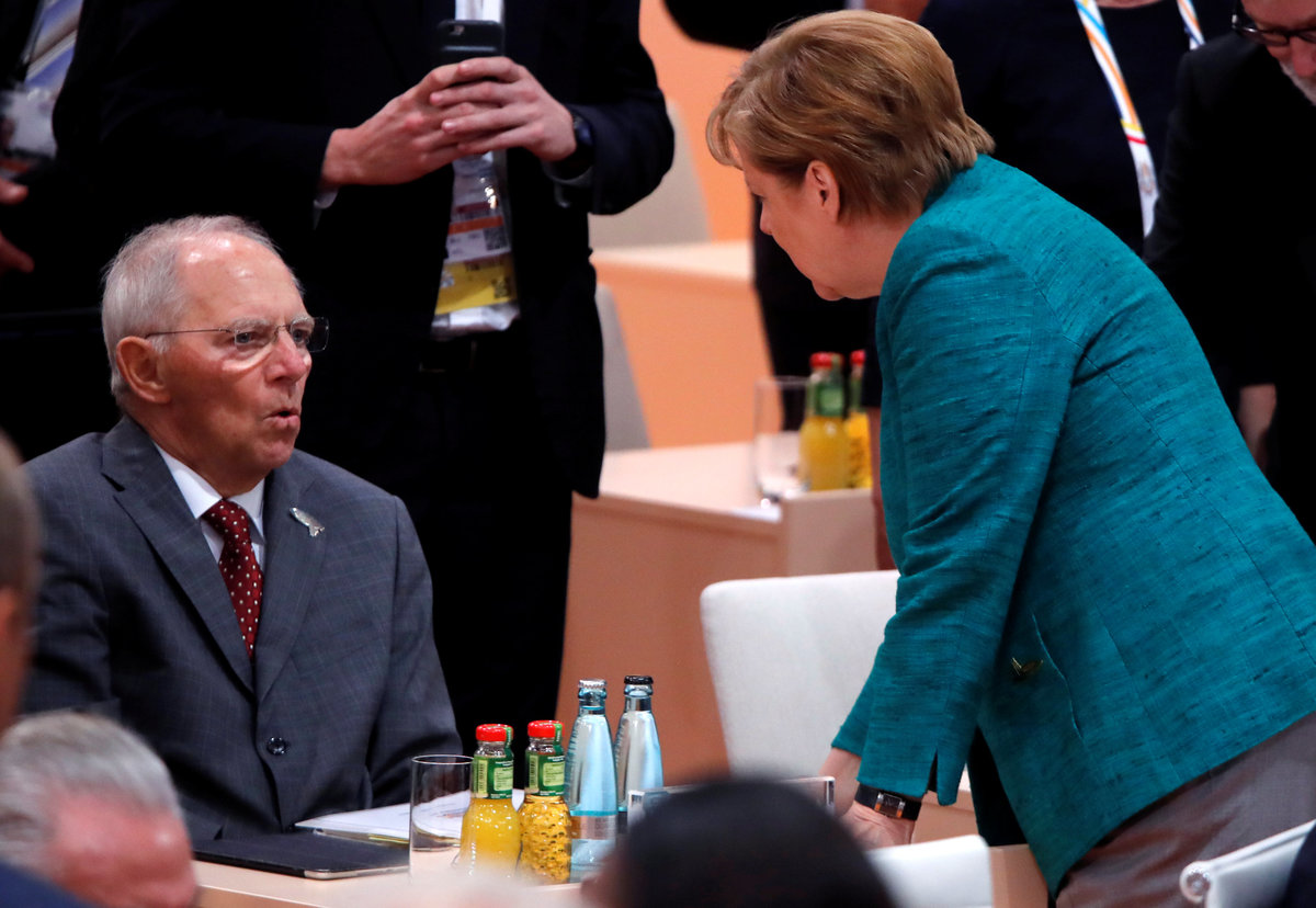 German Chancellor Angela Merkel talks with German Minister of Finance Wolfgang Schaeuble during a working session at the G20 leaders summit in Hamburg, Germany July 8, 2017. REUTERS/Wolfgang Rattay