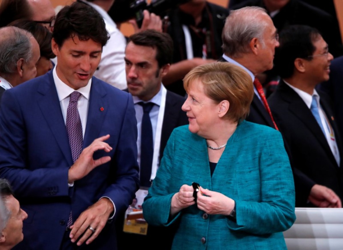 German Chancellor Angela Merkel talks with Canadian Prime Minister Justin Trudeau during a working session at the G20 leaders summit in Hamburg, Germany July 8, 2017. REUTERS/Wolfgang Rattay