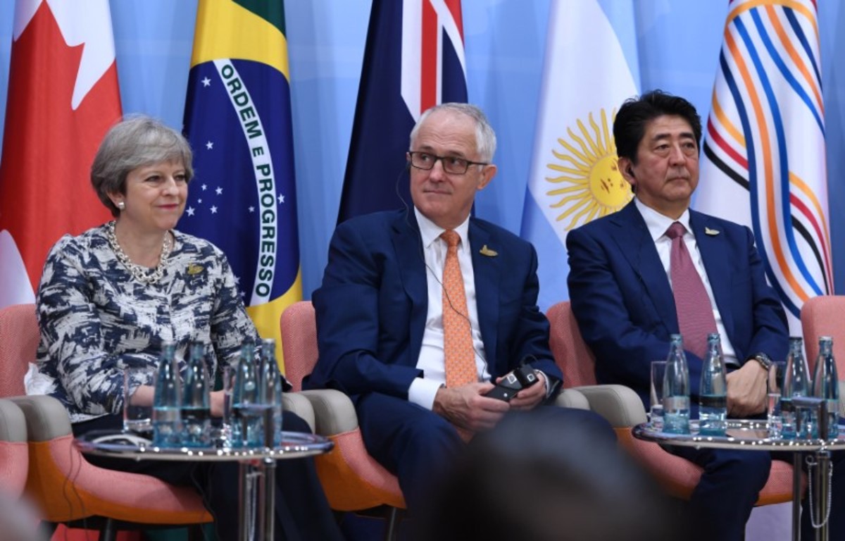 (L to R) Britain's Prime Minister Theresa May, Australia's Prime Minister Malcolm Turnbull and Japan's Prime Minister Shinzo Abe attend the panel discussion "Launch Event Women's Entrepreneur Finance Initiative" on the second day of the G20 Summit in Hamburg, Germany, July 8, 2017. REUTERS/Patrik STOLLARZ/Pool