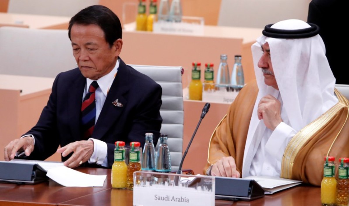 Japan's Minister of Finance Taro Aso and Saudi Arabia Minister of State Ibrahim Abdulaziz Al-Assaf during a working session at the G20 leaders summit in Hamburg, Germany July 8, 2017. REUTERS/Wolfgang Rattay
