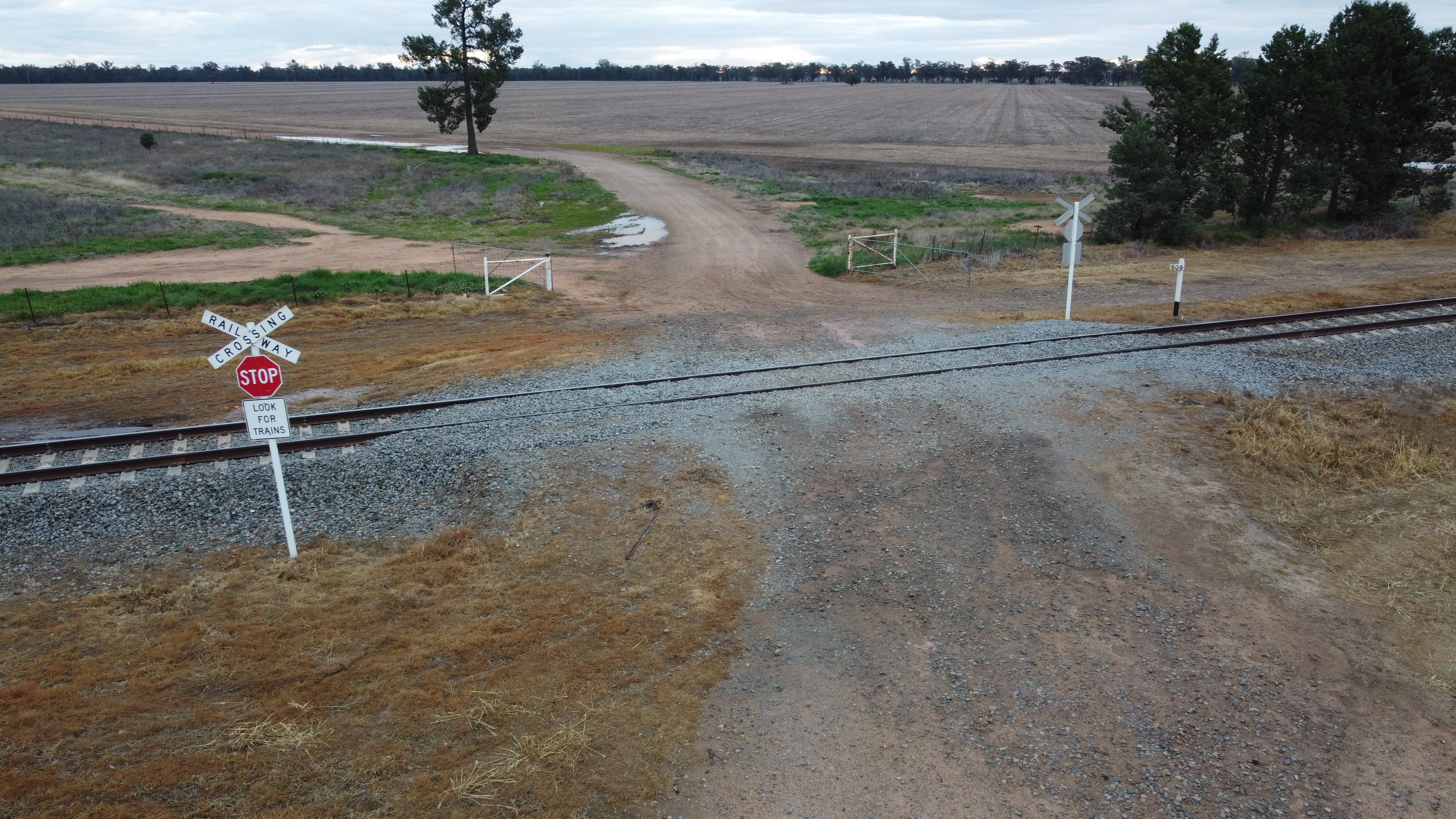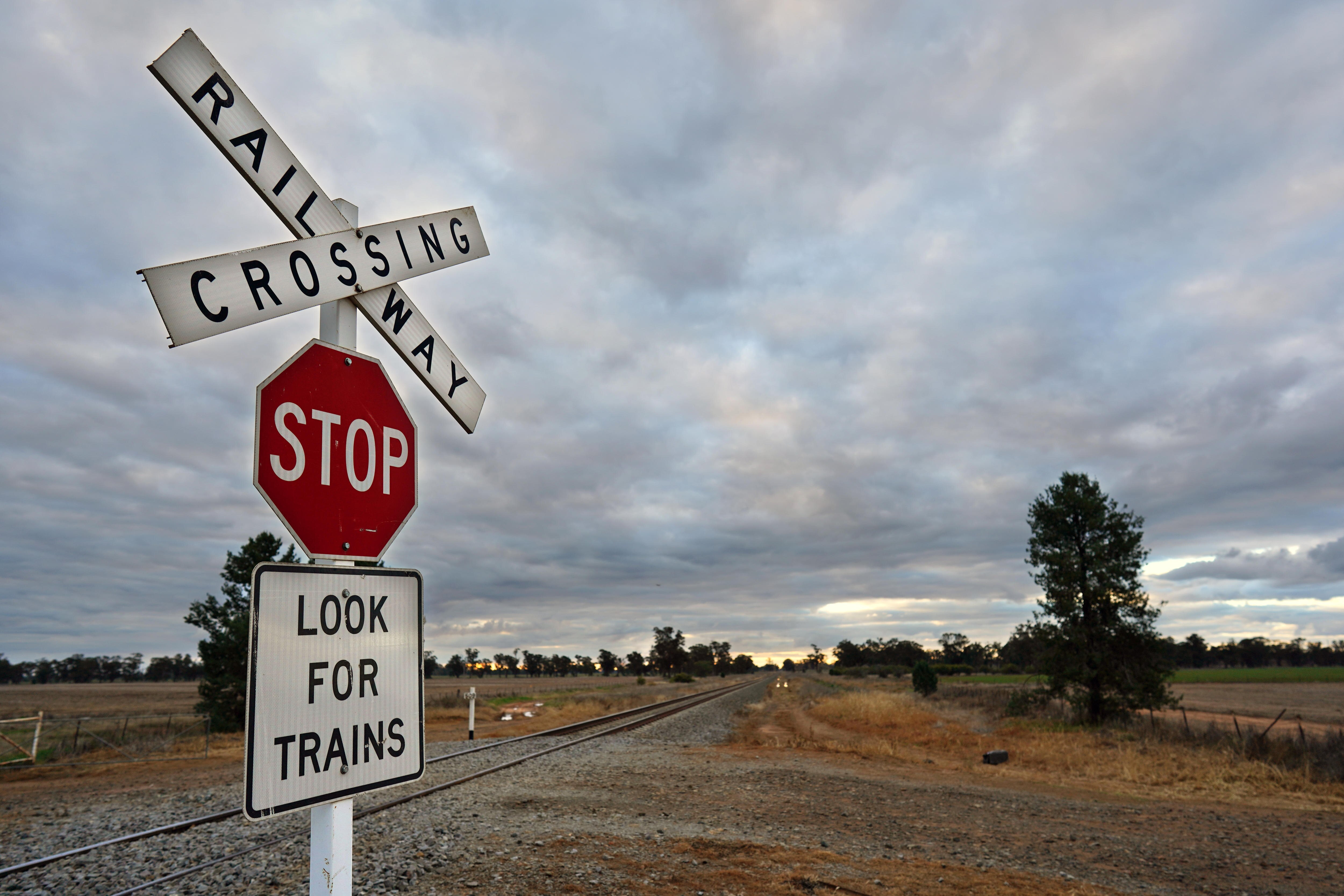 The crossing has no lights or boom gates — just a stop sign with the message "look for trains" — like most of Australia's 23,000 rail crossings.