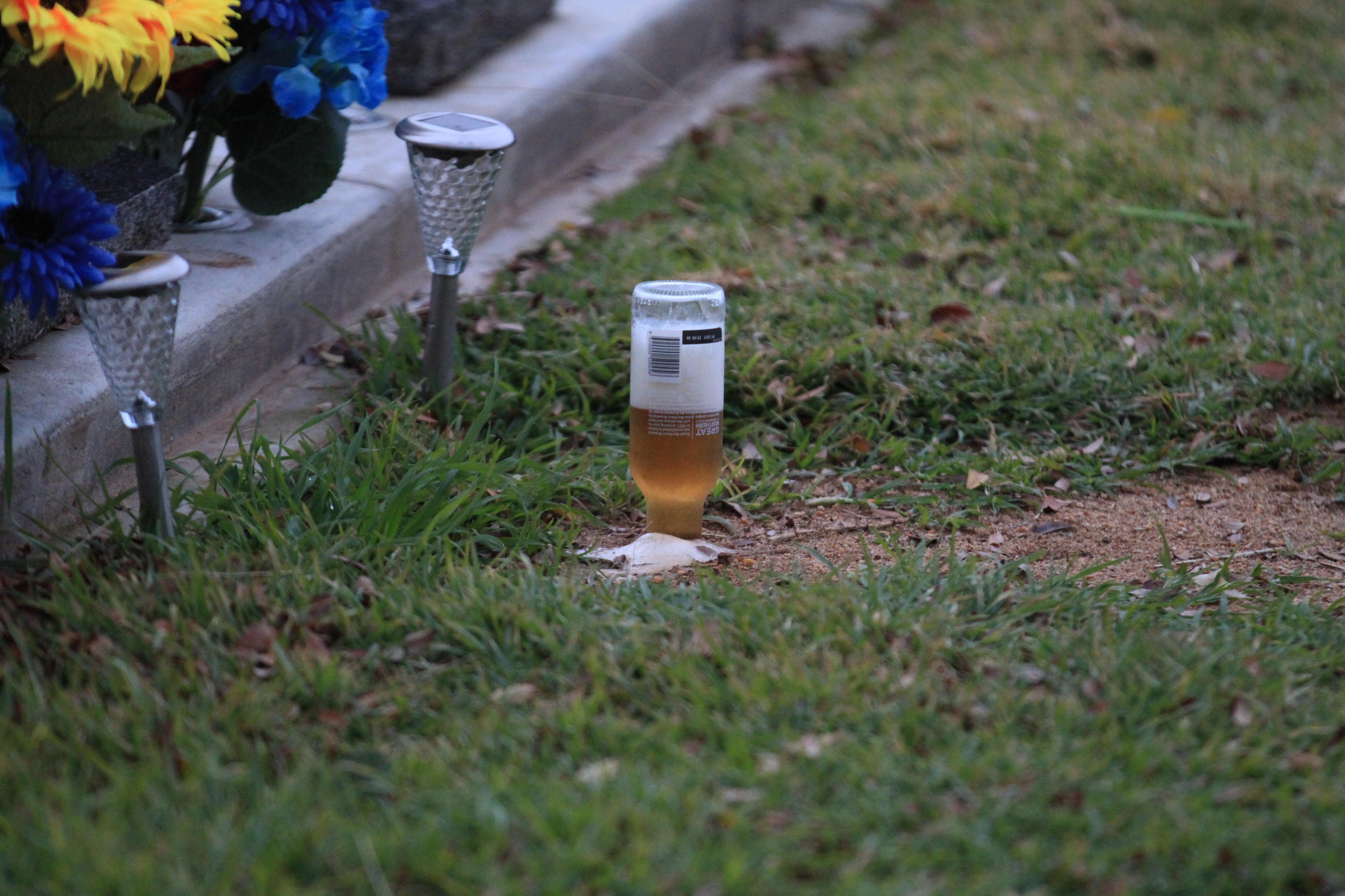 Ethan's best friend twists open a lager and drives the bottle into the soil, as friends pin photos to a board to be erected at the crash site.