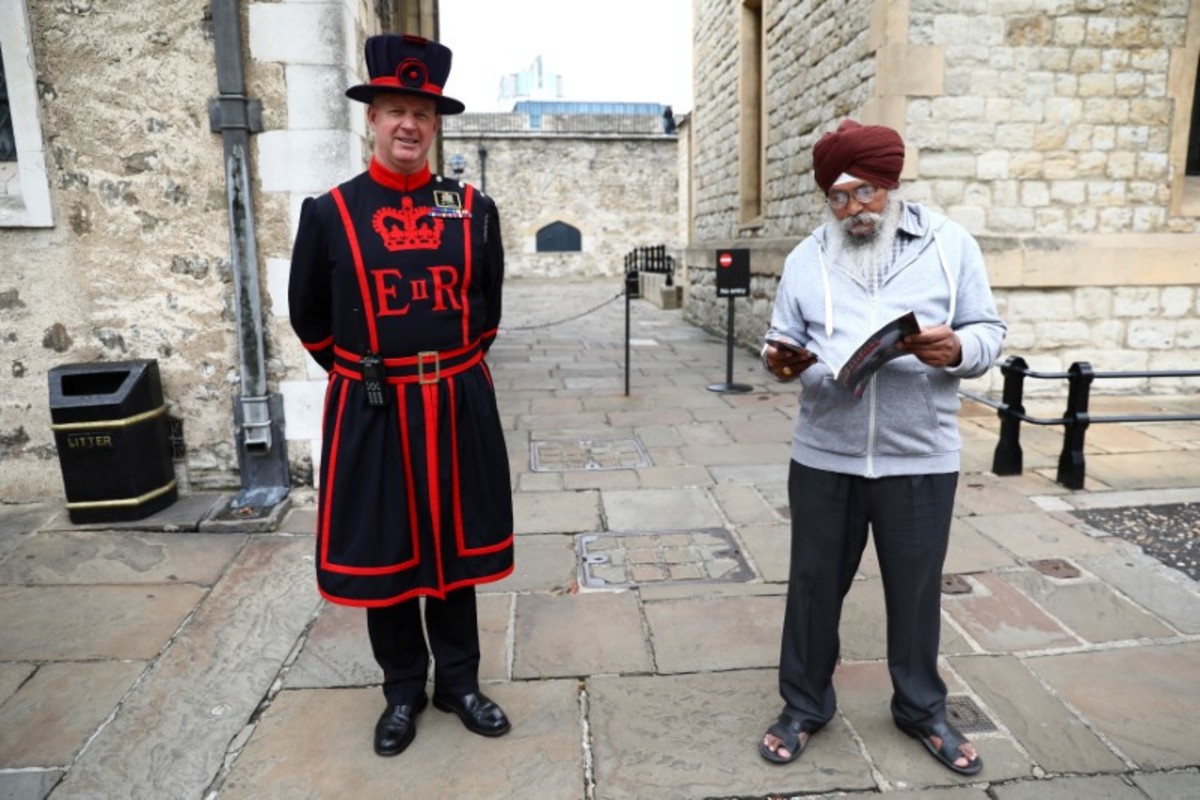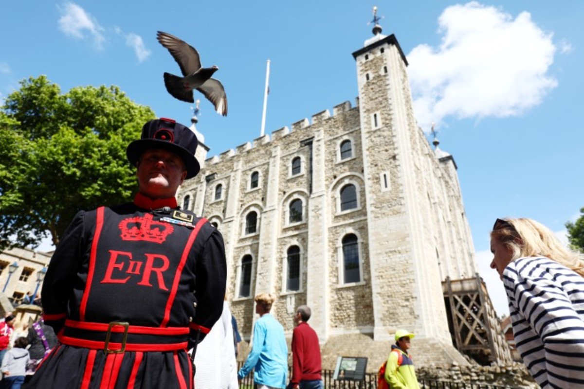 A pigeon passes a Yeoman Warder at the Tower of London in London, Britain July 20, 2017. Picture taken July 20, 2017.REUTERS/Neil Hall