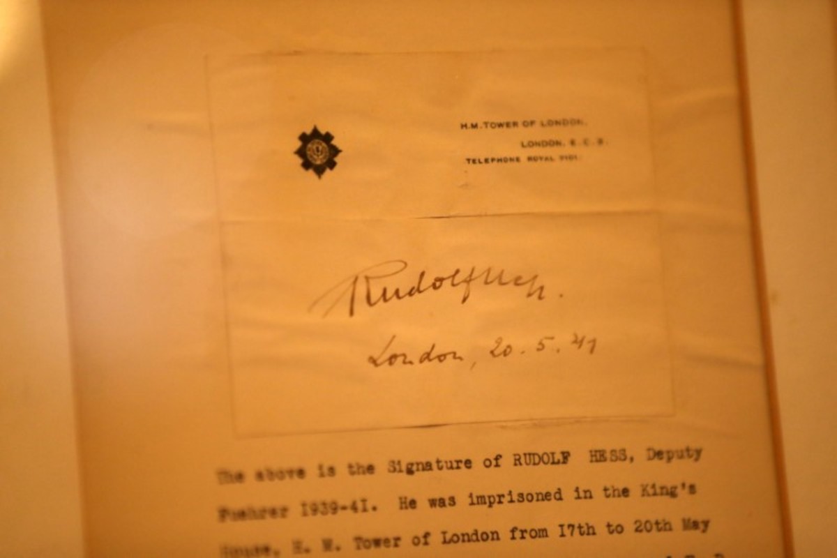Other memorabilia includes a framed document bearing the signature of Rudolf Hess. The Nazi politician was briefly imprisoned at the Tower in 1941 after being caught in Scotland during a failed secret peace mission. He was one of the last prominent people to be held prisoner there.