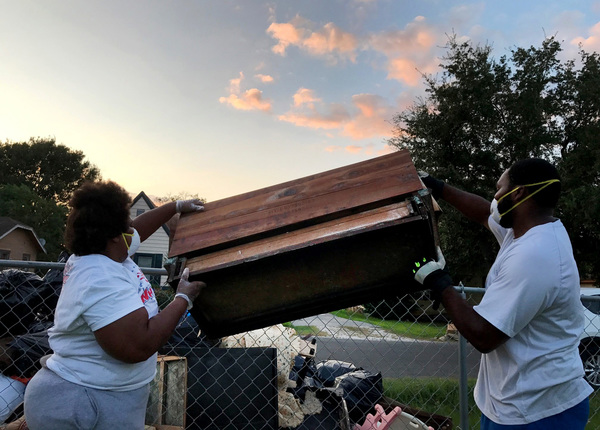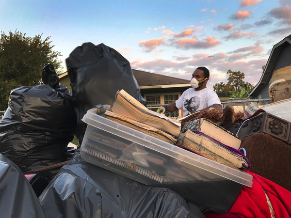 Down the street in badly hit Port Arthur, neighbors were doing the same thing. Wearing masks and gloves, they created snowdrift-like heaps of trash, throwing away things that marked moments in their lives.