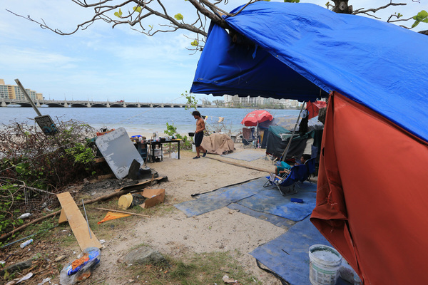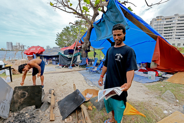 More drifters soon arrived. Local media did stories on them. Relief organizations and San Juan residents began dropping off supplies. And more than a month after the storm, the homeless encampment has mushroomed into a full-fledged, if tiny, community complete with nightly domino games and nonstop cookouts.