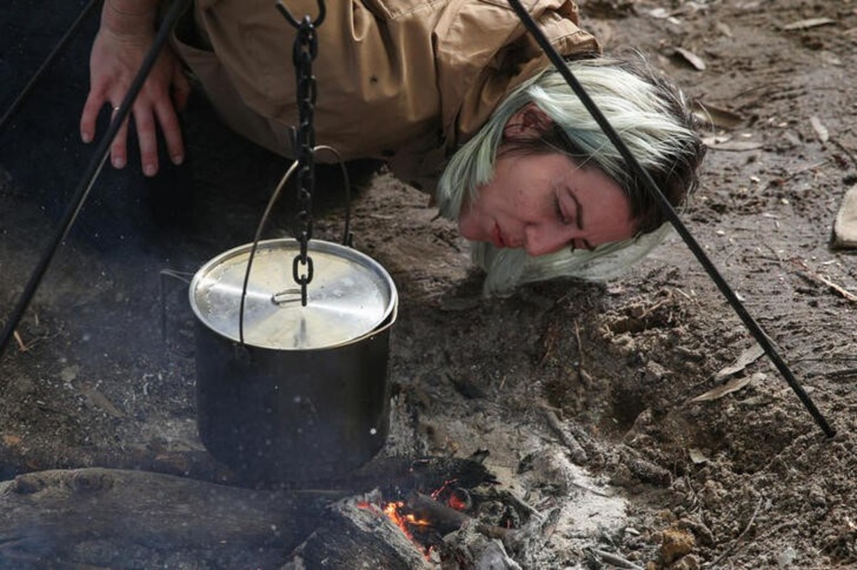 Teaching assistant Natalie Ziolkowski blows air on a fire to fuel it while boiling water at a wilderness survival basic skills course, which has seen an increase in demand since the coronavirus disease (COVID-19) outbreak, in the Ingleside suburb of northern Sydney, Australia, May 31, 2020. REUTERS/Loren Elliott