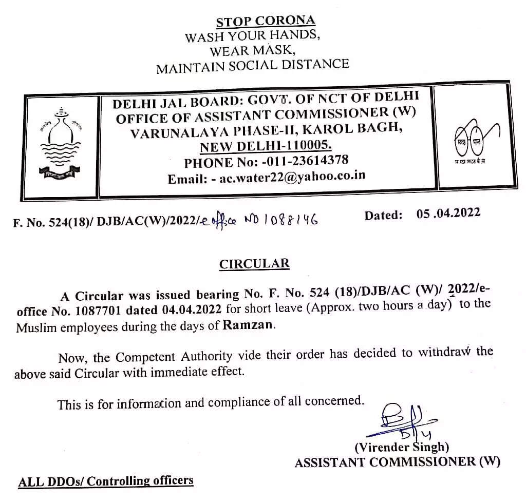 NEW DELHI: The Delhi Jal Board (DJB) on Tuesday withdrew its circular for short leave to all its Muslim employees during the days of Ramzan after opposition from BJP.