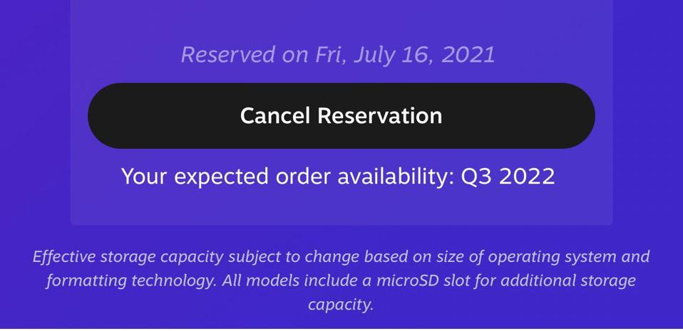 One Redditor, for example, reserved theirs the same day I did (photo above, July 16) and their expected availability has changed to Q3 2022. I plunked down my deposit exactly 36 minutes after reservations opened, and mine still sits at Q2 2022. It’s entirely possible that mere minutes separated these transactions.