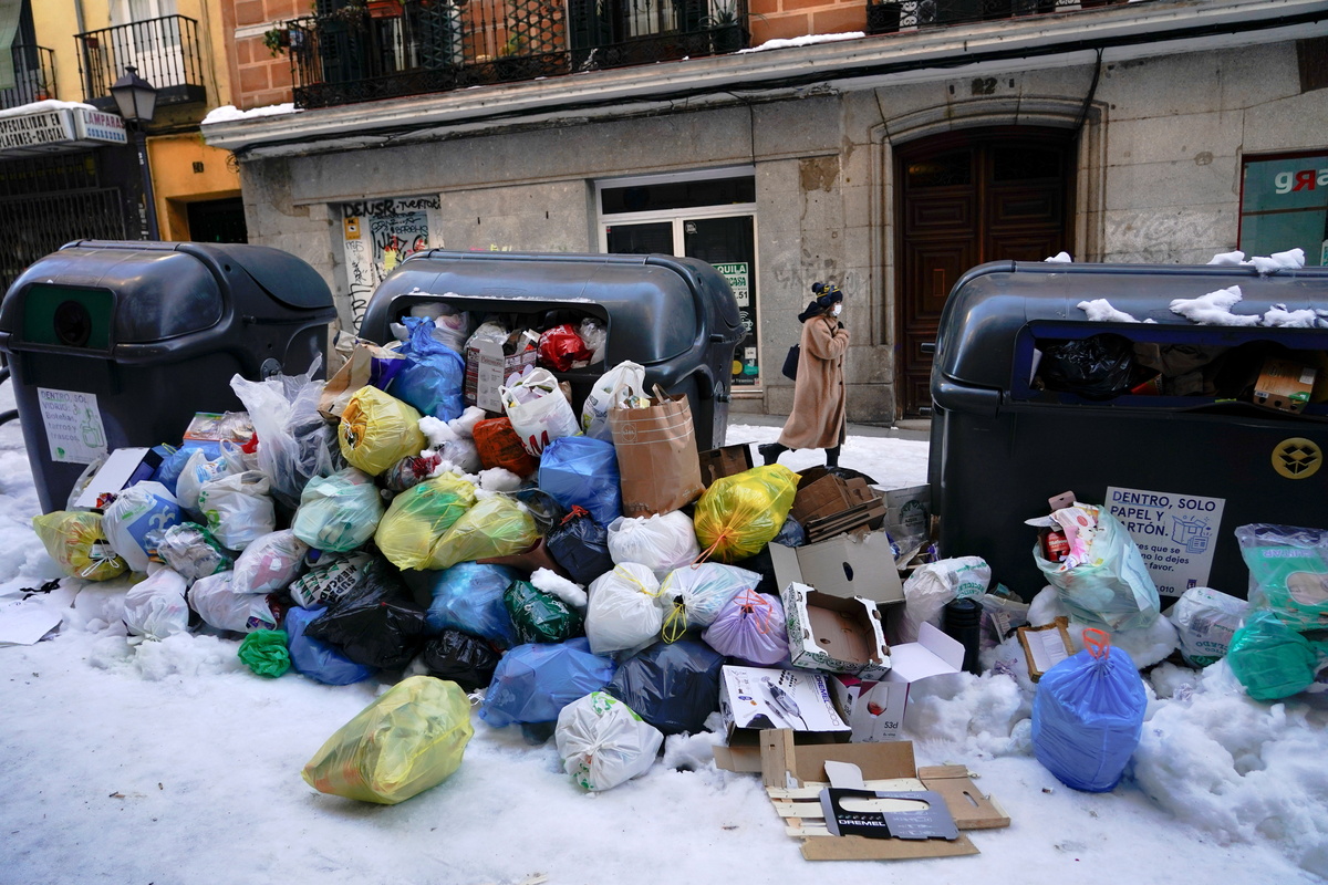 Heaps of plastic rubbish bags were piled up alongside snowdrifts in downtown Madrid on Wednesday after a historic storm paralysed the city's infrastructure, leaving some 9,000 tonnes of uncollected waste lining its streets.