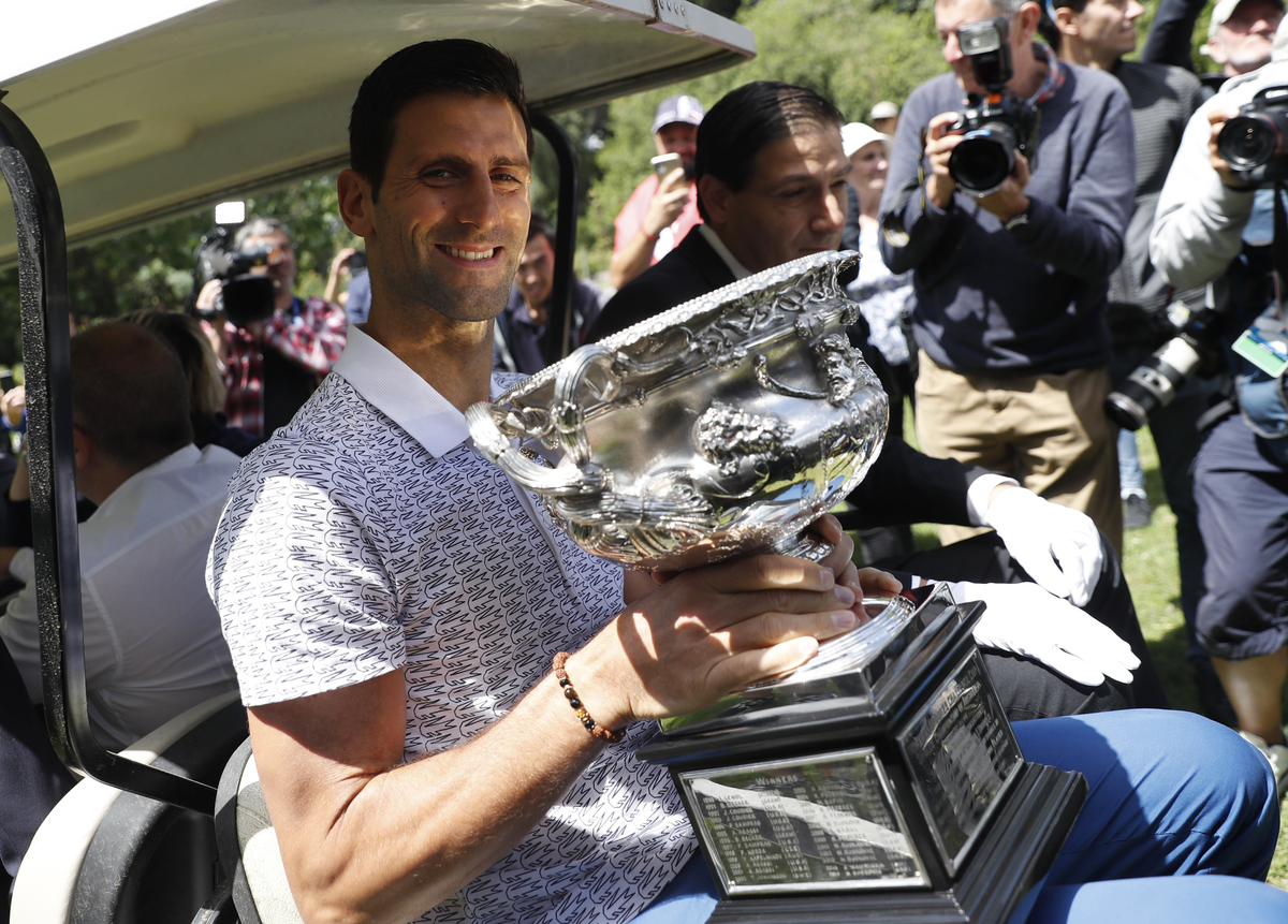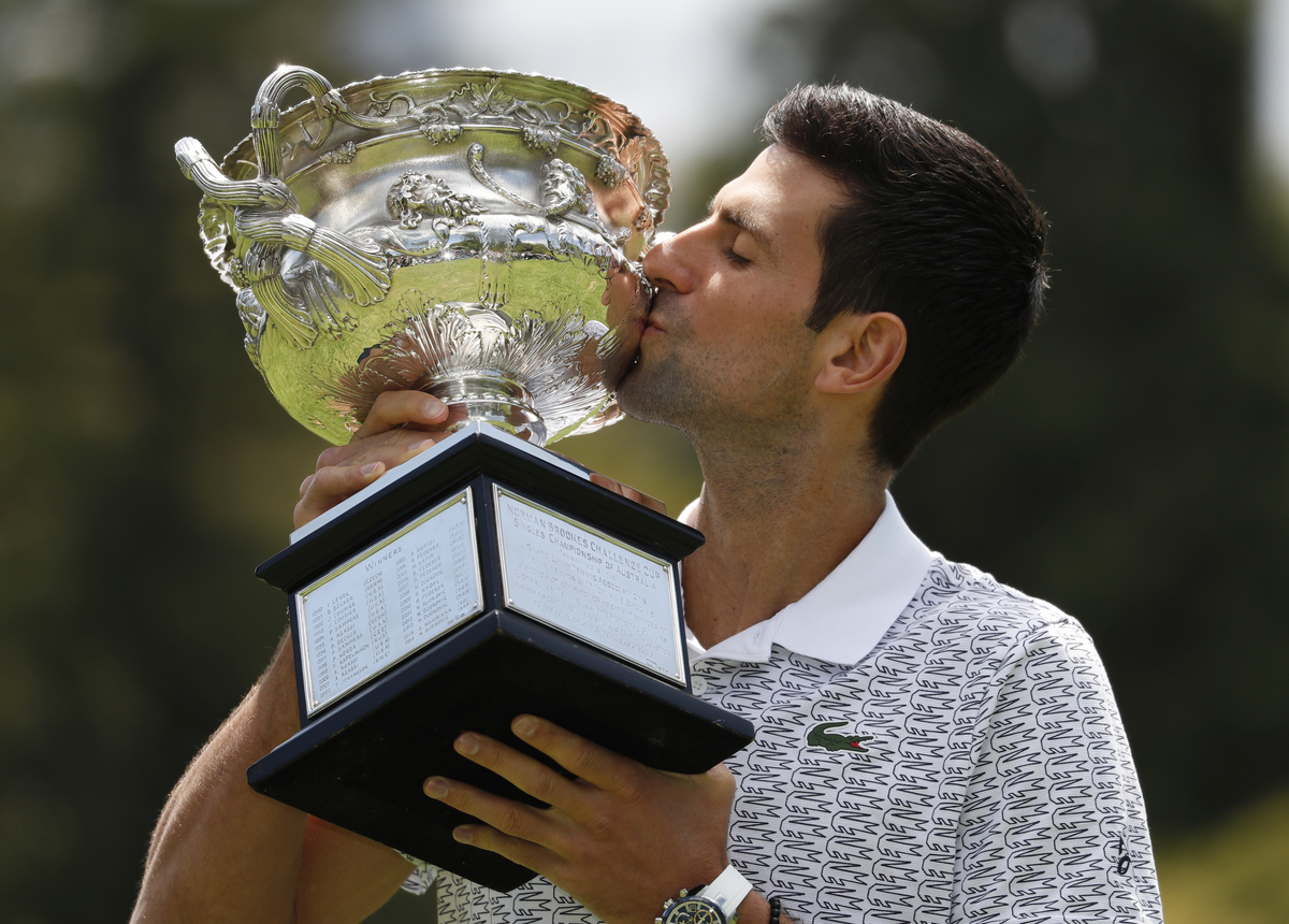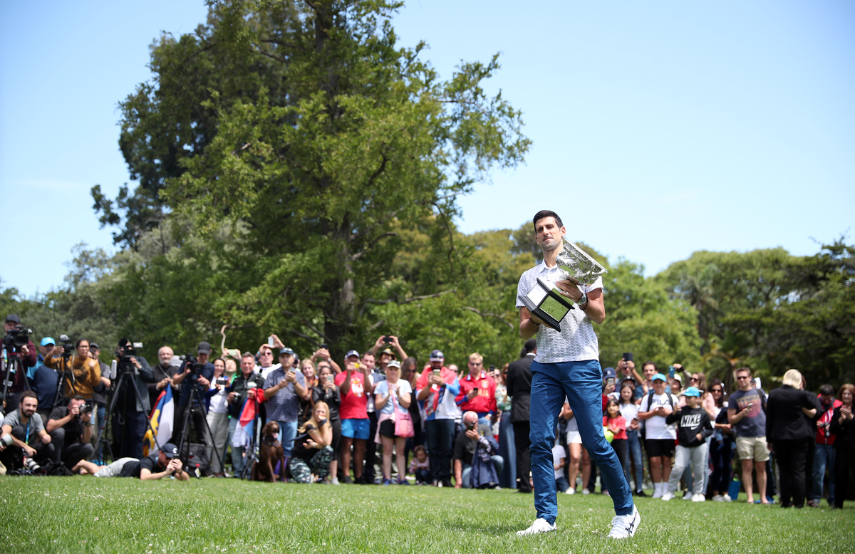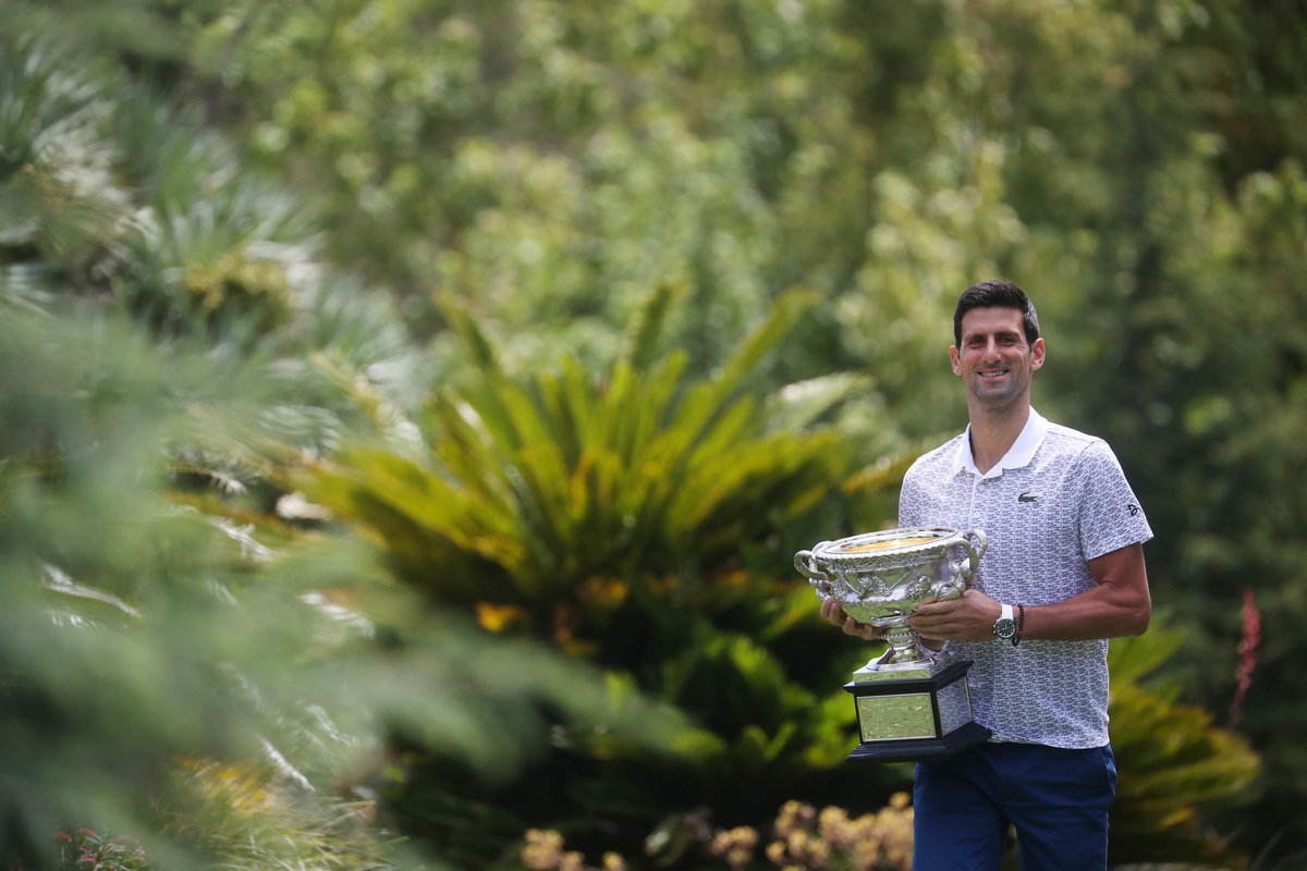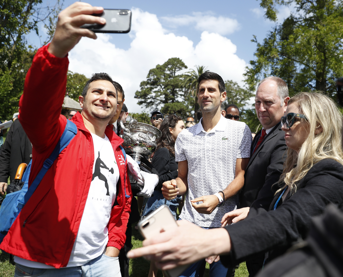 Tennis - Australian Open - Men's Singles Photo Shoot - Royal Botanic Gardens Victoria, Melbourne, Australia - February 3, 2020. Australian Open champion Serbia's Novak Djokovic poses with the trophy during a photo shoot at the Royal Botanic Gardens Victoria. REUTERS/Hannah MckayTennis - Australian Open - Men's Singles Photo Shoot - Royal Botanic Gardens Victoria, Melbourne, Australia - February 3, 2020. Australian Open champion Serbia's Novak Djokovic poses with a fan during a photo shoot at the Royal Botanic Gardens Victoria. REUTERS/Issei KatoTennis - Australian Open - Men's Singles Photo Shoot - Royal Botanic Gardens Victoria, Melbourne, Australia - February 3, 2020. Australian Open champion Serbia's Novak Djokovic poses with the trophy during a photo shoot at the Royal Botanic Gardens Victoria. REUTERS/Hannah MckayTennis - Australian Open - Men's Singles Photo Shoot - Royal Botanic Gardens Victoria, Melbourne, Australia - February 3, 2020. Australian Open champion Serbia's Novak Djokovic poses with the trophy during a photo shoot at the Royal Botanic Gardens Victoria. REUTERS/Hannah Mckay