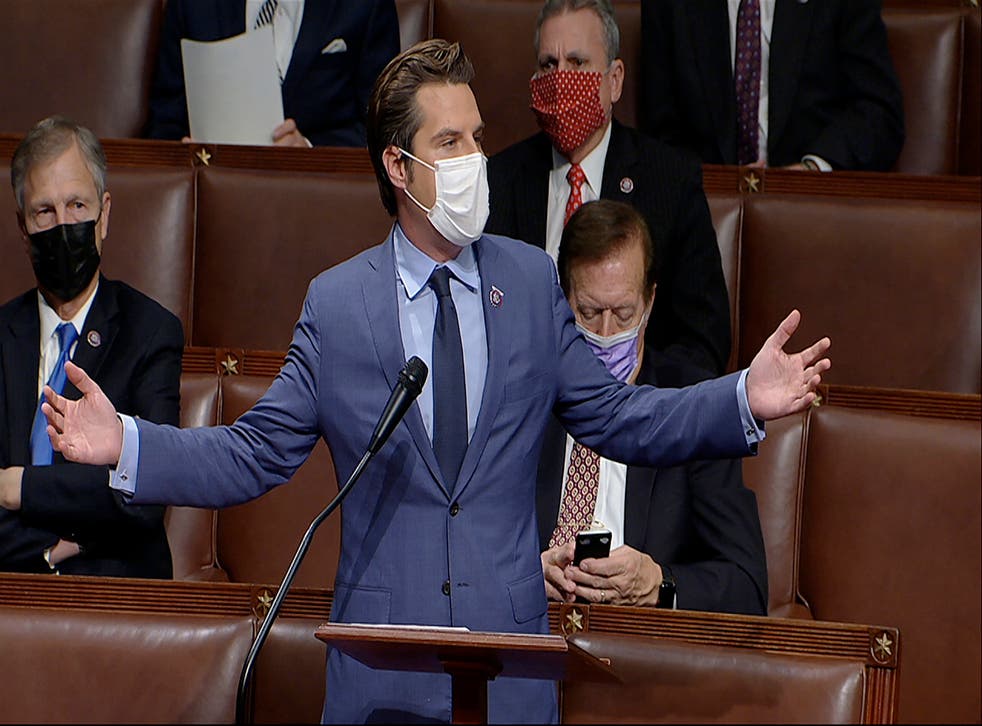 At around the same time, Mr Gaetz deployed the “colour revolution” line on the floor of the House when he joined just four other members (all of them Republicans) in voting against the resolution backing a peaceful transfer of power.