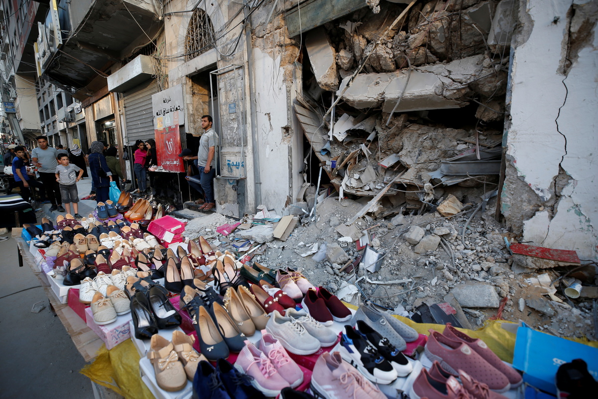 At a street stall in Gaza's busy Rimal neighbourhood, Mohammad Al-Qassas laments the destruction of his shoe store in the fighting as he sells goods that he salvaged from the rubble.