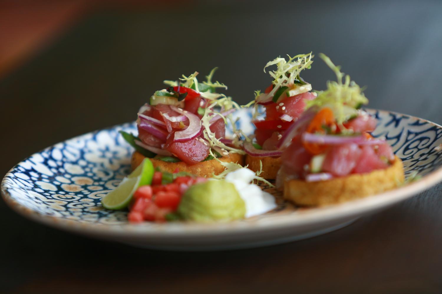 Among the worth-having light bites is tuna tartare sopes (450 baht). Arriving on tortilla bread was sashimi-grade raw tuna coarsely diced and dressed with guacamole, sour cream, fresh-tomato salsa, fresh jalapeno peppers, sesame and frisée.
