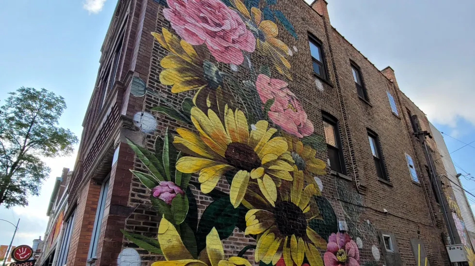 On a wall outside West Town Bakery, 1916 W. Chicago Ave., her latest Chicago mural features larger-than-life flowers and a red admiral butterfly.