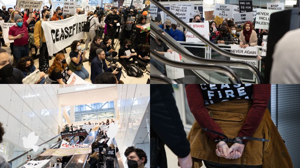 Protest at Ogilvie Transportation Center: Hundreds of protesters chanting “ceasefire now” blocked escalators to the Israel consulate above the Ogilvie Transportation Center this morning. Organizers said the protest was the largest Midwest gathering of Jews in solidarity with Palestinians.