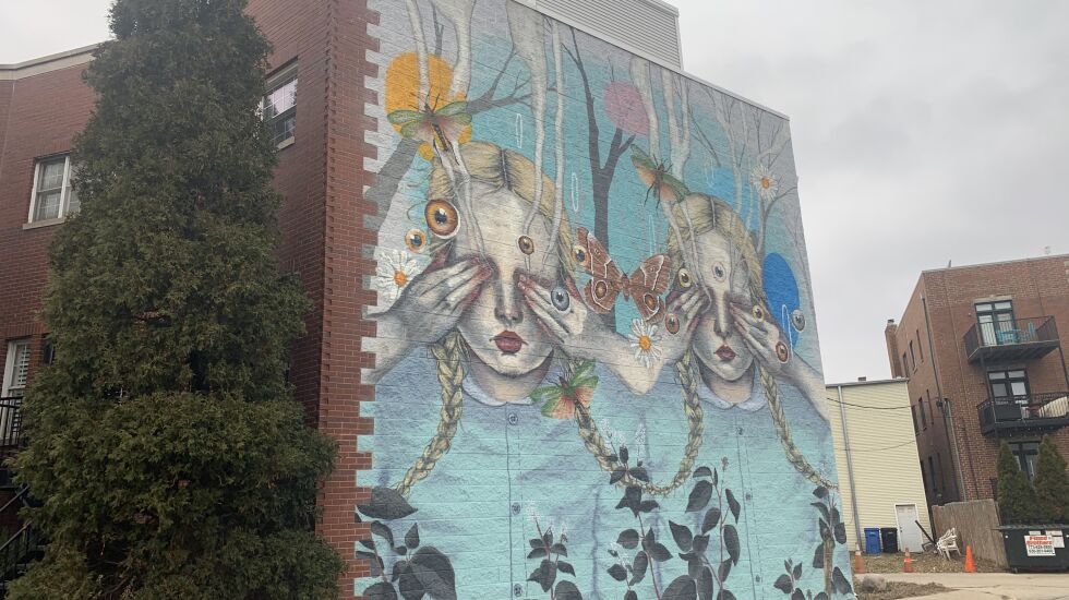 The mural in Logan Square stands three stories high and features images of two girls, seemingly twins, side by side in a kind of wilderness.
