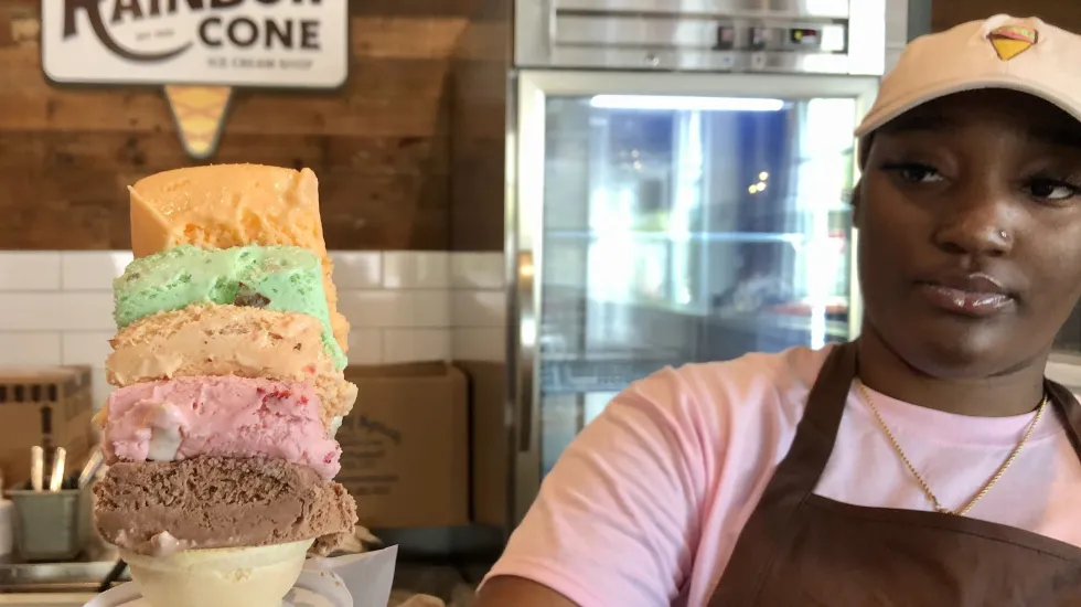 Rainbow Cone’s fivefold path is, from top to bottom: orange sherbet, followed by four ice creams: pistachio, Palmer House (New York vanilla with walnuts and cherries), strawberry and chocolate.