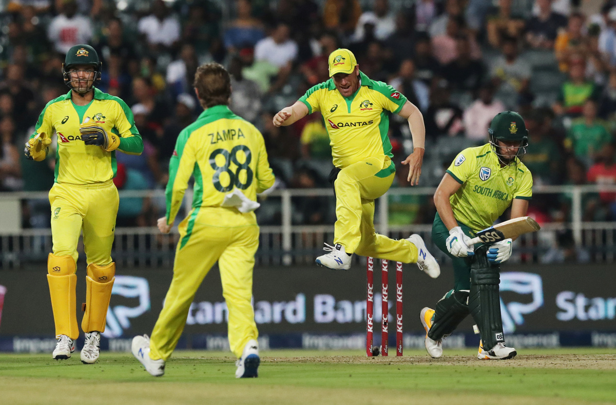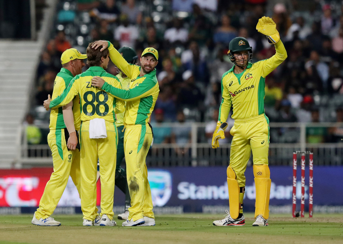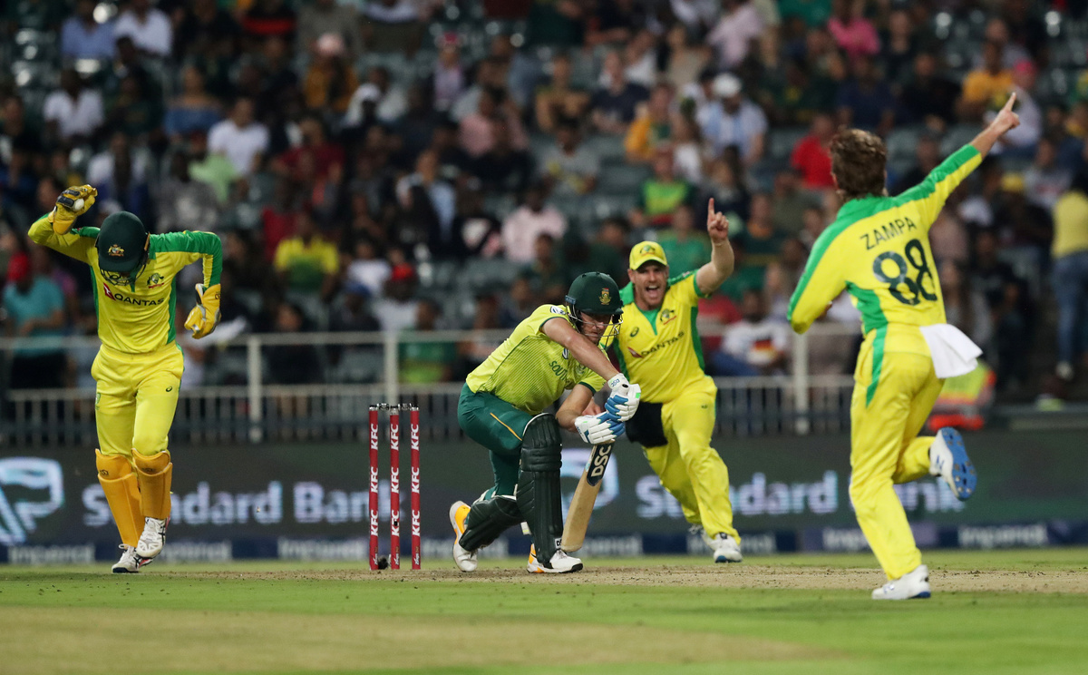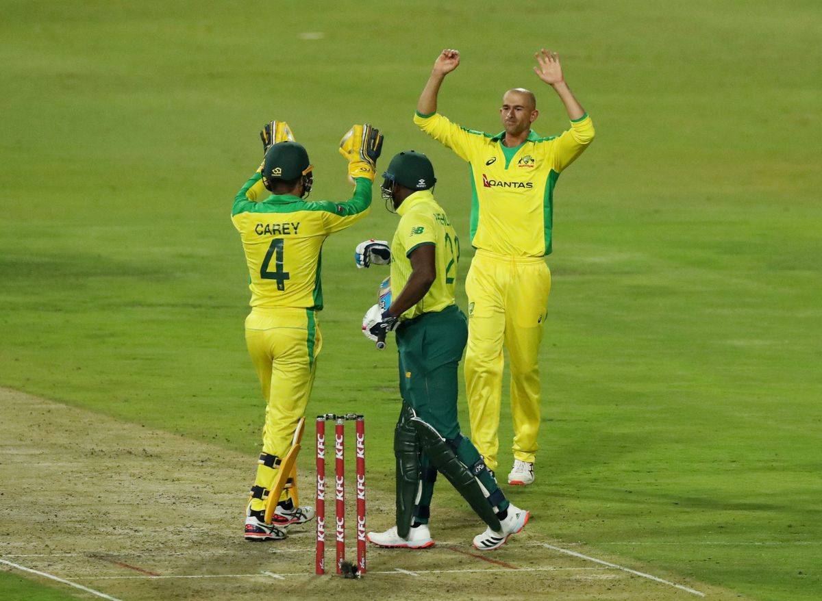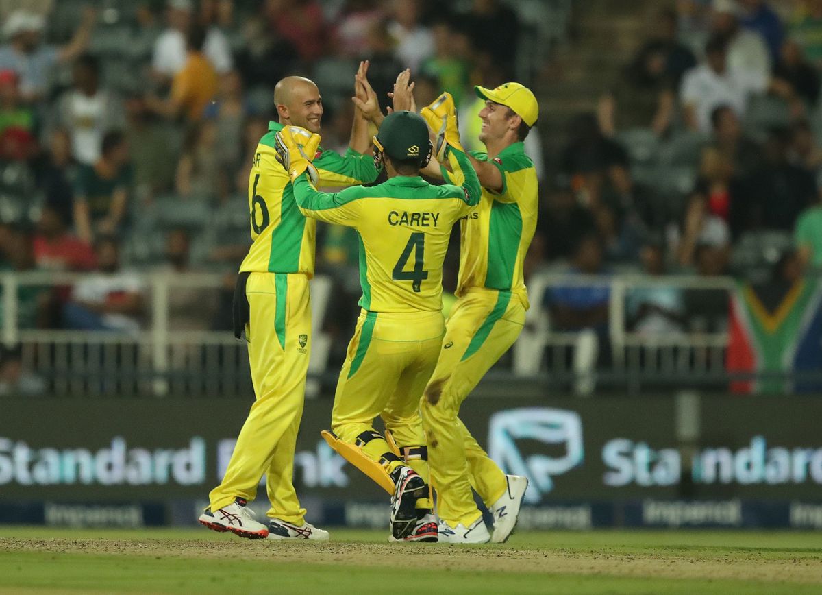 Cricket - South Africa v Australia - First T20 - Imperial Wanderers Stadium, Johannesburg, South Africa - February 21, 2020 Austalia's Ashton Agar celebrates with Alex Carey after taking the wicket of South Africa's Andile Phehlukwayo Action Images via Reuters/Mike HutchingsCricket - South Africa v Australia - First T20 - Imperial Wanderers Stadium, Johannesburg, South Africa - February 21, 2020 Austalias' Aaron Finch and teammates celebrate taking the wicket of South Africa's David Miller Action Images via Reuters/Mike HutchingsCricket - South Africa v Australia - First T20 - Imperial Wanderers Stadium, Johannesburg, South Africa - February 21, 2020 Austalias' Aaron Finch and teammates celebrate taking the wicket of South Africa's David Miller Action Images via Reuters/Mike HutchingsCricket - South Africa v Australia - First T20 - Imperial Wanderers Stadium, Johannesburg, South Africa - February 21, 2020 Austalias' Aaron Finch and teammates celebrate taking the wicket of South Africa's David Miller Action Images via Reuters/Mike HutchingsCricket - South Africa v Australia - First T20 - Imperial Wanderers Stadium, Johannesburg, South Africa - February 21, 2020 South Africa's Faf du Plessis in action Action Images via Reuters/Mike HutchingsCricket - South Africa v Australia - First T20 - Imperial Wanderers Stadium, Johannesburg, South Africa - February 21, 2020 Australia's Pat Cummins celebrates with Steve Smith after taking the wicket of South Africa's Rassie van der Dussen Action Images via Reuters/Mike HutchingsCricket - South Africa v Australia - First T20 - Imperial Wanderers Stadium, Johannesburg, South Africa - February 21, 2020 Australia's Pat Cummins celebrates with teammates after taking the wicket of South Africa's Rassie van der Dussen Action Images via Reuters/Mike HutchingsCricket - South Africa v Australia - First T20 - Imperial Wanderers Stadium, Johannesburg, South Africa - February 21, 2020 Australia's Pat Cummins celebrates taking the wicket of South Africa's Rassie van der Dussen Action Images via Reuters/Mike HutchingsCricket - South Africa v Australia - First T20 - Imperial Wanderers Stadium, Johannesburg, South Africa - February 21, 2020 Australia's Mitchell Starc appeals unsuccessfully for the wicket of South Africa's Faf du Plessis Action Images via Reuters/Mike Hutchings