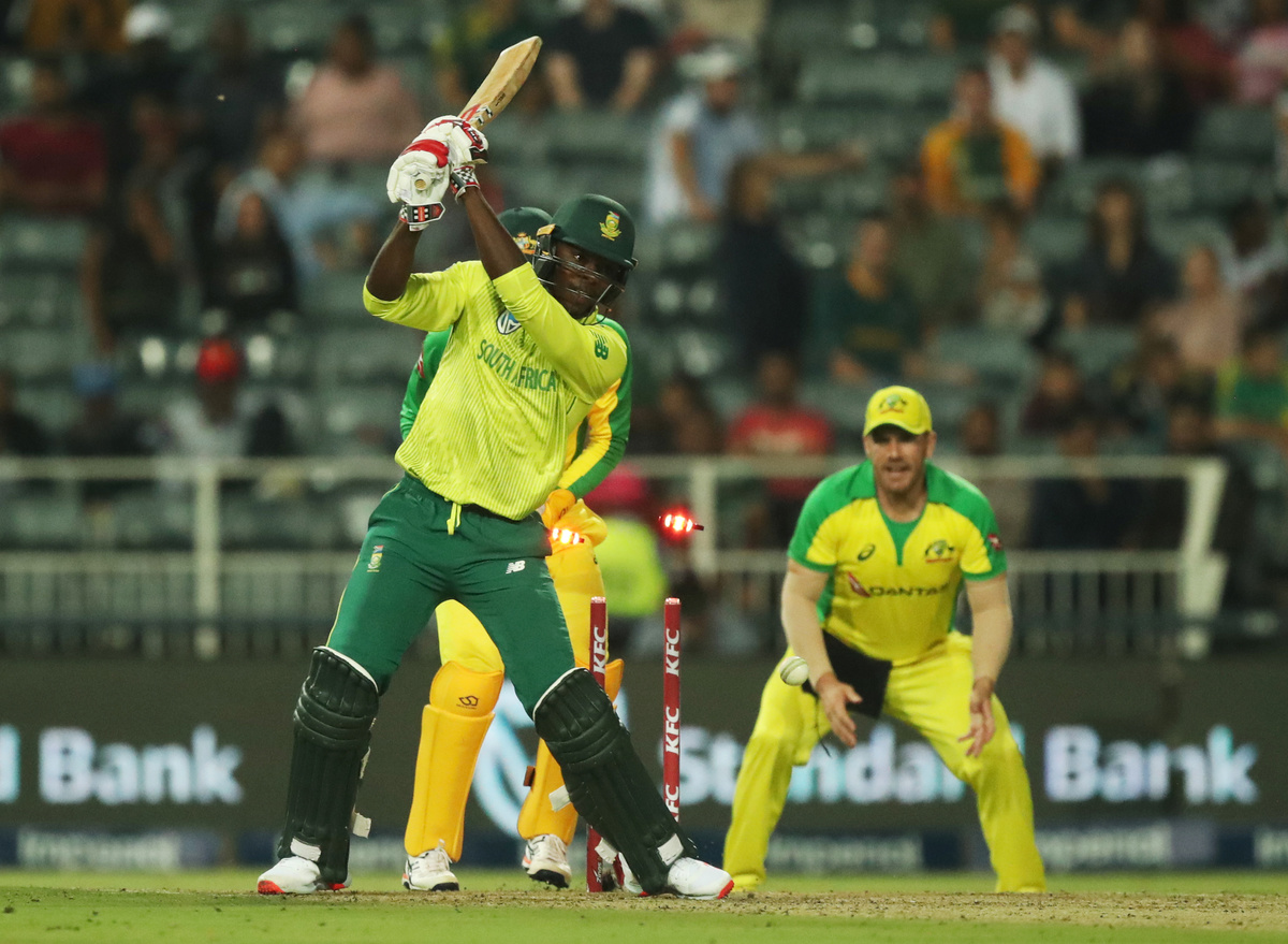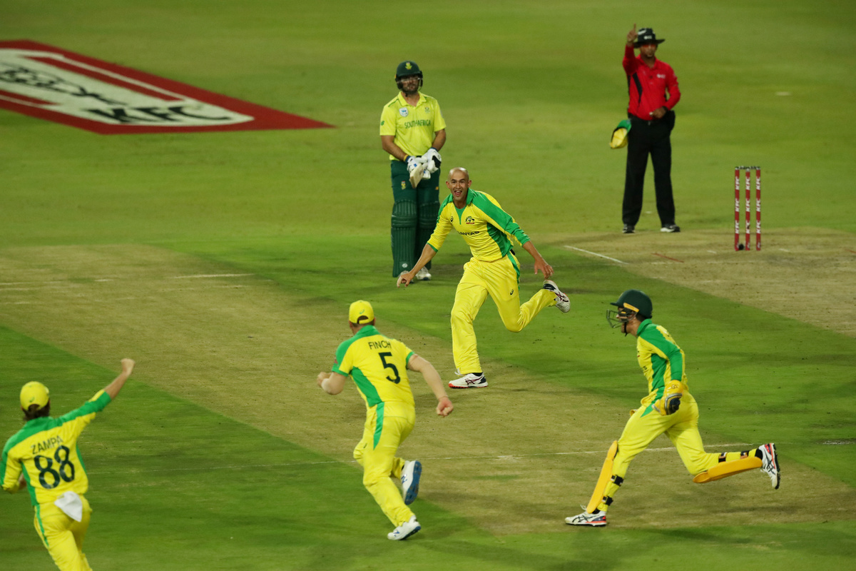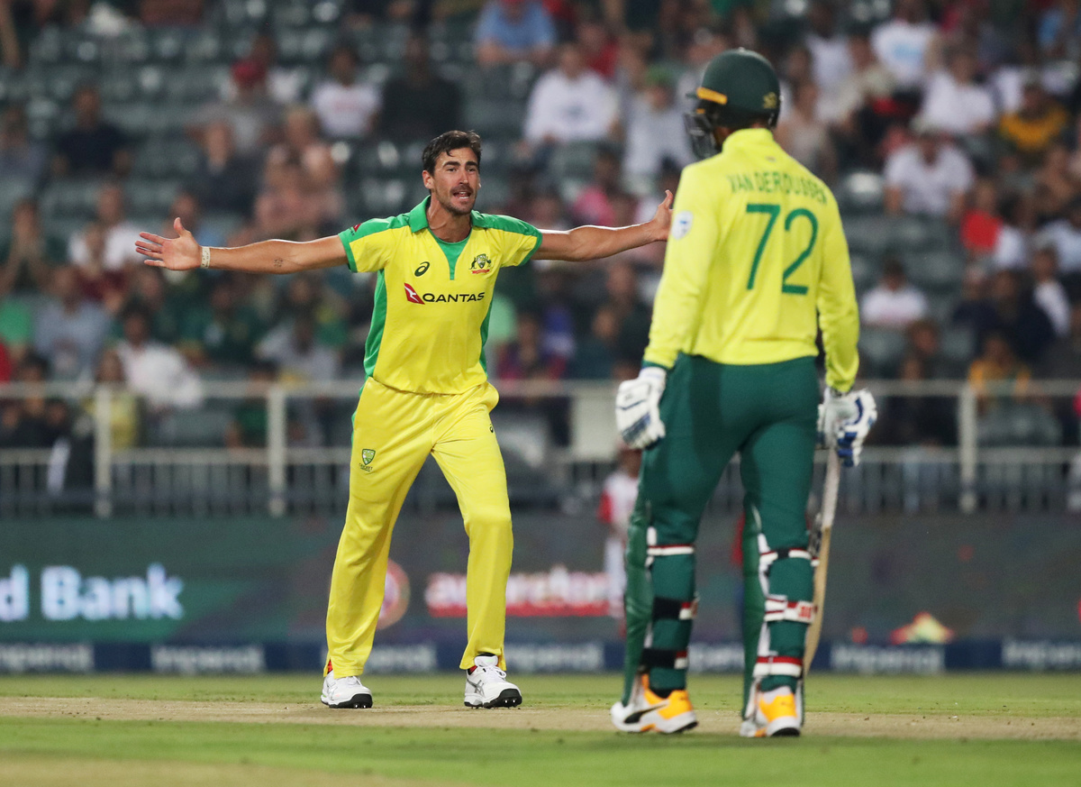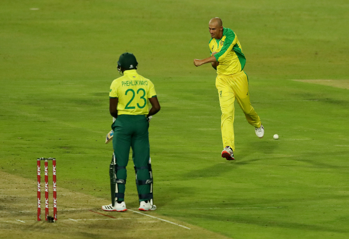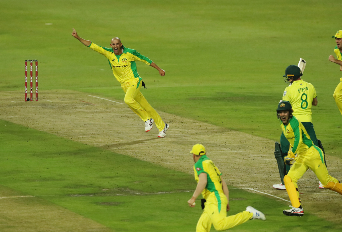 Cricket - South Africa v Australia - First T20 - Imperial Wanderers Stadium, Johannesburg, South Africa - February 21, 2020 Austalia's Ashton Agar celebrates with Alex Carey after taking the wicket of South Africa's Andile Phehlukwayo Action Images via Reuters/Mike HutchingsCricket - South Africa v Australia - First T20 - Imperial Wanderers Stadium, Johannesburg, South Africa - February 21, 2020 Austalias' Aaron Finch and teammates celebrate taking the wicket of South Africa's David Miller Action Images via Reuters/Mike HutchingsCricket - South Africa v Australia - First T20 - Imperial Wanderers Stadium, Johannesburg, South Africa - February 21, 2020 Austalias' Aaron Finch and teammates celebrate taking the wicket of South Africa's David Miller Action Images via Reuters/Mike HutchingsCricket - South Africa v Australia - First T20 - Imperial Wanderers Stadium, Johannesburg, South Africa - February 21, 2020 Austalias' Aaron Finch and teammates celebrate taking the wicket of South Africa's David Miller Action Images via Reuters/Mike HutchingsCricket - South Africa v Australia - First T20 - Imperial Wanderers Stadium, Johannesburg, South Africa - February 21, 2020 South Africa's Faf du Plessis in action Action Images via Reuters/Mike HutchingsCricket - South Africa v Australia - First T20 - Imperial Wanderers Stadium, Johannesburg, South Africa - February 21, 2020 Australia's Pat Cummins celebrates with Steve Smith after taking the wicket of South Africa's Rassie van der Dussen Action Images via Reuters/Mike HutchingsCricket - South Africa v Australia - First T20 - Imperial Wanderers Stadium, Johannesburg, South Africa - February 21, 2020 Australia's Pat Cummins celebrates with teammates after taking the wicket of South Africa's Rassie van der Dussen Action Images via Reuters/Mike HutchingsCricket - South Africa v Australia - First T20 - Imperial Wanderers Stadium, Johannesburg, South Africa - February 21, 2020 Australia's Pat Cummins celebrates taking the wicket of South Africa's Rassie van der Dussen Action Images via Reuters/Mike HutchingsCricket - South Africa v Australia - First T20 - Imperial Wanderers Stadium, Johannesburg, South Africa - February 21, 2020 Australia's Mitchell Starc appeals unsuccessfully for the wicket of South Africa's Faf du Plessis Action Images via Reuters/Mike Hutchings