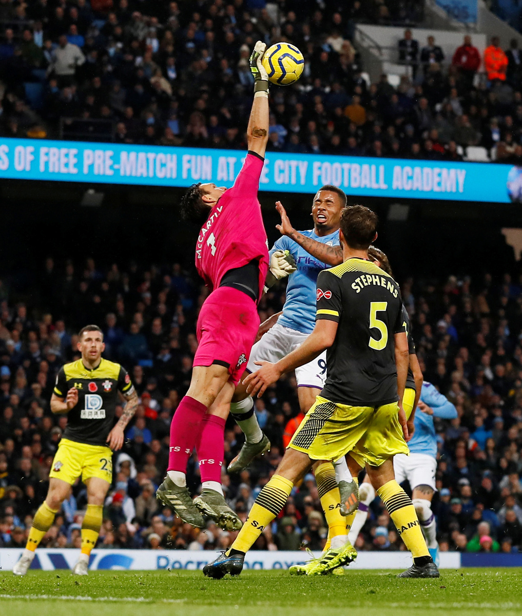 (Reuters) - Manchester City survived a scare at home to a battling Southampton as late goals from Sergio Aguero and Kyle Walker earned them a 2-1 victory in the Premier League on Saturday.