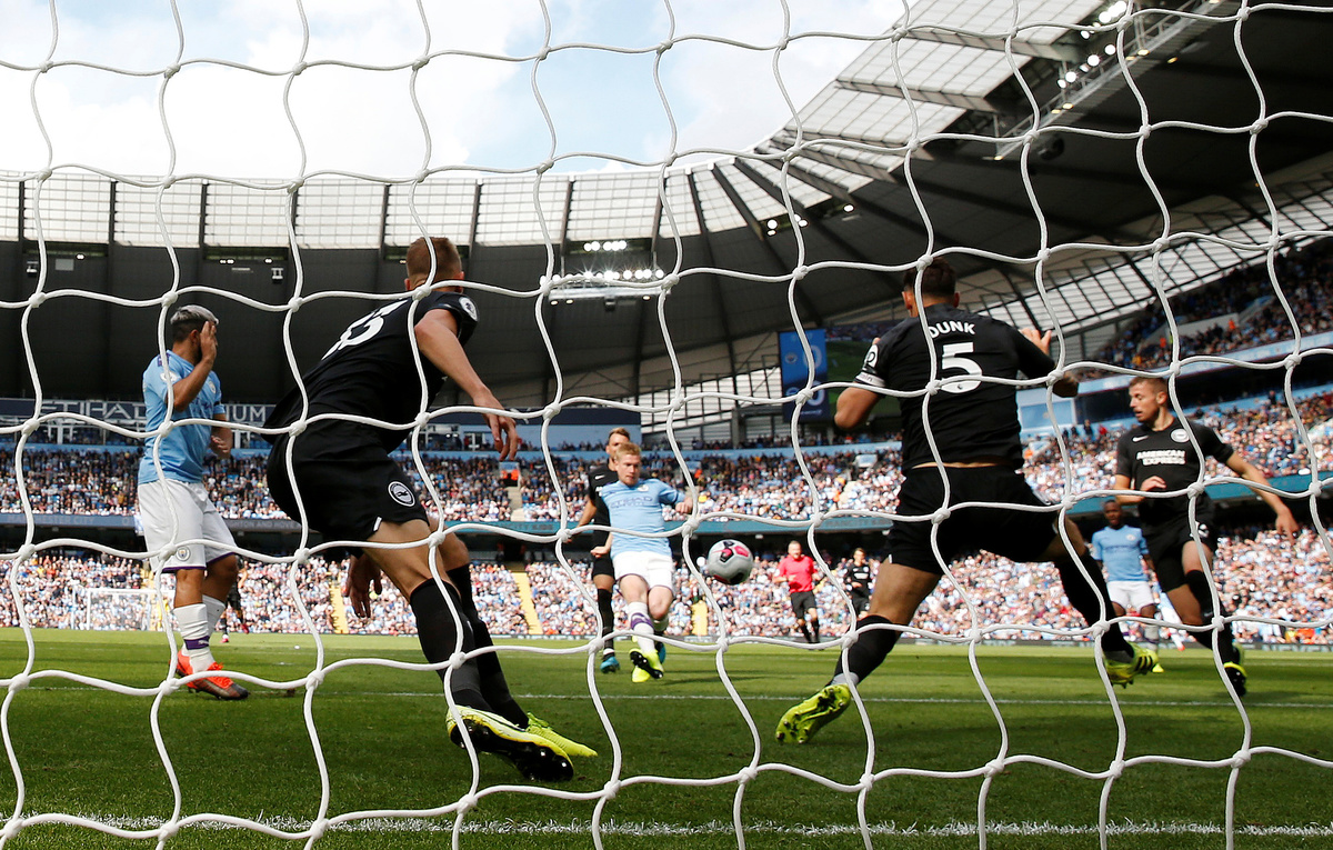 City's win was even more emphatic and never in doubt from the moment Kevin de Bruyne put them ahead in the second minute. With Sergio Aguero scoring twice to keep up his record of scoring in each of City's four league games and substitute Bernardo Silva netting with his second touch, it was business as usual for City, who lost French defender Aymeric Laporte with what looked like a serious knee injury.