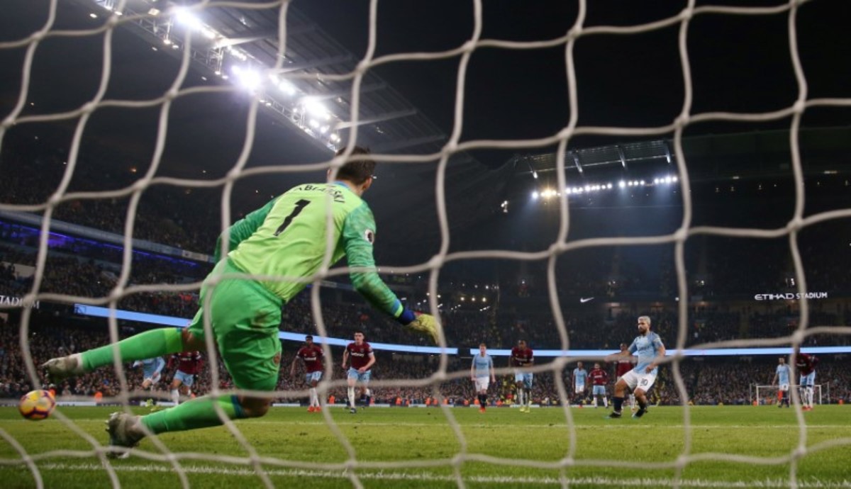 Manchester City needed the award of a soft penalty, converted by Sergio Aguero, to beat West Ham United and stay a point behind leaders Liverpool with a 1-0 win on Wednesday.