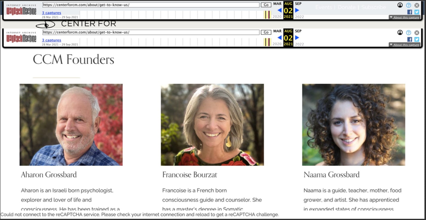 According to the Wayback Machine, in October of 2021, one month after Hall published his allegations, CIIS removed a link from its website; the page was a 2016 program from CIIS’s Certificate in Psychedelic-Assisted Therapy and Research program which lists Bourzat and Grossbard under a lecture titled “The Integrative Process.”