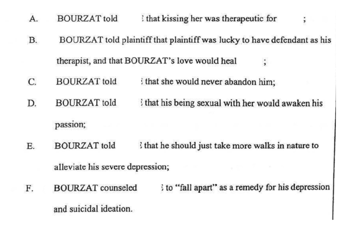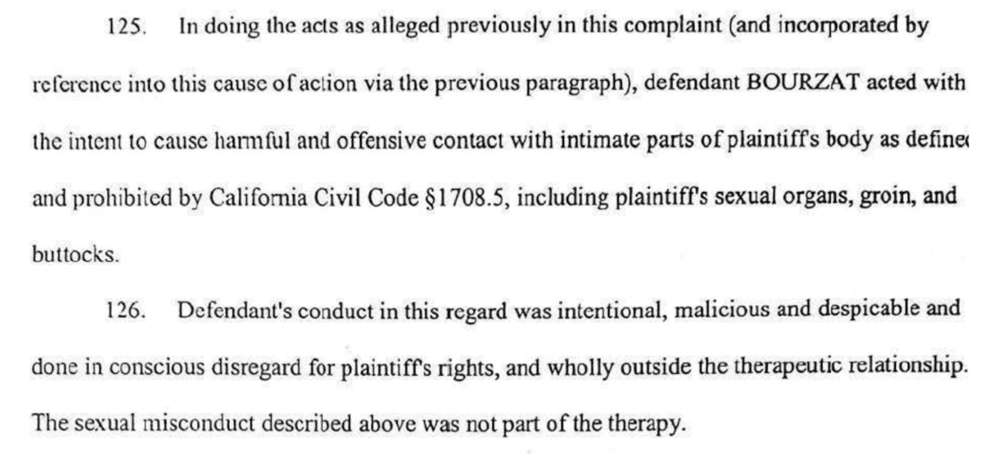 In a lawsuit filed in San Francisco Superior Court, the former client also alleges Bourzat began a four-year sexual relationship, “not limited to acts of kissing, hugging and fondling” and contact with intimate body parts, including “sexual organs, groin, and buttocks… Bourzat told [Smith] that their kissing was therapeutic. Bourzat encouraged and allowed [Smith] to kiss her, as well as kissing him… On at least one occasion, Bourzat told [Smith] that her love would heal him and that he was lucky to have her as his therapist. Bourzat told [Smith] she would never abandon him…”