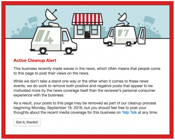 Yelp flagged the page on Monday, with an alert saying the site would “work to remove both positive and negative posts that appear to be motivated more by news coverage that the reviewer’s personal consumer experience with the business.”
