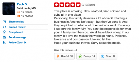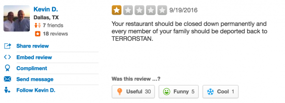 The one-star Yelp reviews came from states across the US, including Texas and California. Some were crass or tasteless, others openly Islamophobic. “Spend your money on businesses that don’t hate America,” one advised. “I hope your son gets waterboarded,” read another. A reviewer from Louisiana described the Rahamis as “Filthy Mohammedan Savages.”