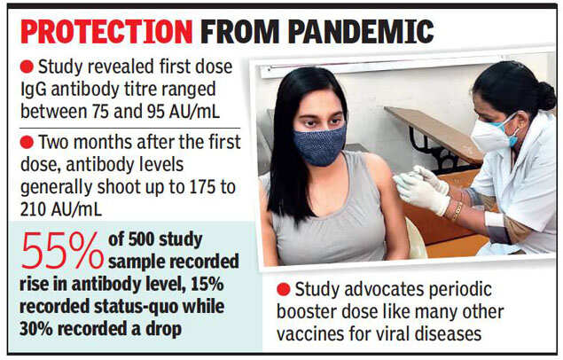 With regards to antibodies post-vaccination in healthcare workers, Dr Bhavini Shah, head (microbiology), Neuberg Diagnostics, told TOI that they had chosen 500 vaccinated doctors, nurses, paramedics and other members of medical fraternity, whose antibody titre (blood test to determine presence and level of antibodies) was collected.