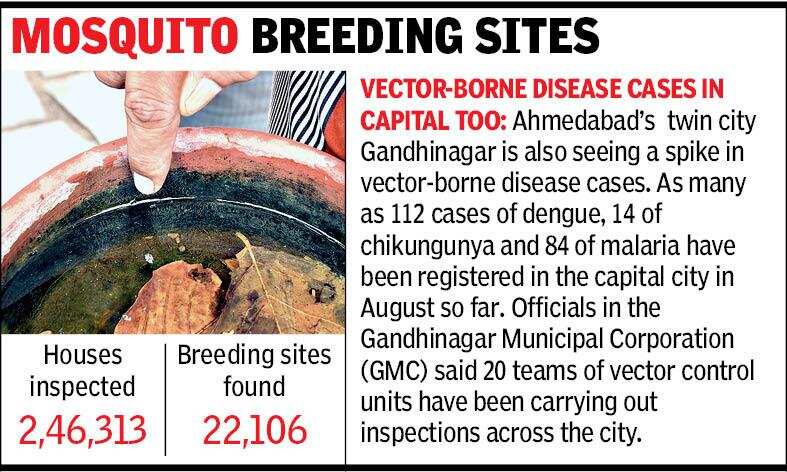 AHMEDABAD: To curb the growing number of cases of vector borne diseases in the city, the health department of the Ahmedabad Municipal Corporation (AMC) checked 2,46,313 homes on Friday and Saturday. Teams from the AMC’s seven zones found 22,106 mosquito breeding sites in these homes.