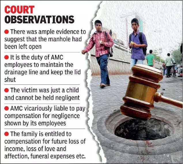 AHMEDABAD: A city civil court ordered the Ahmedabad Municipal Corporation (AMC) to pay Rs 1.50 lakh compensation for its negligence, which resulted in the death of a seven-year-old boy, who died after falling into a manhole because AMC employees did not shut its lid. The order for compensation comes some 14 years after the incident.