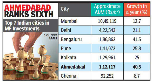 AHMEDABAD: Buoyed by fresh inflows into equity mutual funds, Ahmedabad has pipped Chennai in mutual fund (MF) investments and it now ranks sixth among Indian cities with highest mutual fund asset base.