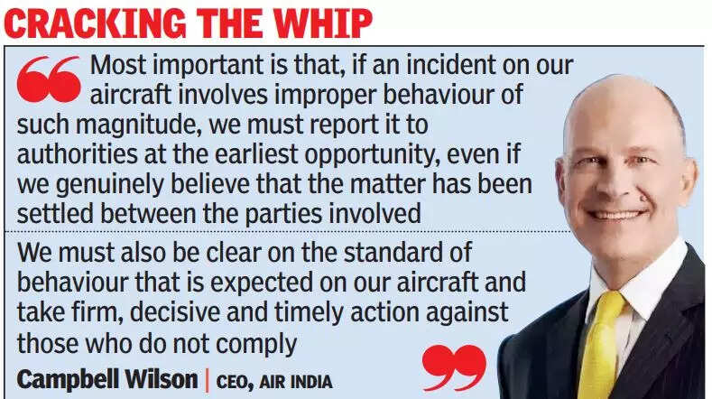 MUMBAI: After perpetrators in two midair drunk-urination cases within a fortnight on Air India flights were allowed to leave on landing, the airline finally issued a circular instructing its crew to adhere to the laid-down norms on handling such situations. Air India crew should report any improper behaviour on aircraft to regulatory authorities on landing even if the matter appears to have been settled, said CEO Campbell Wilson in an internal mail to its staff.