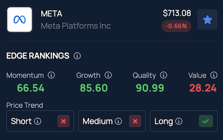 Meta ranks highly in Benzinga's Edge Stock Rankings for Momentum, Growth and Quality, indicating strong long-term price performance, though it shows a downward trend in the short and medium term. Explore a complete analysis of the stock, including comparisons with its peers and competitors.