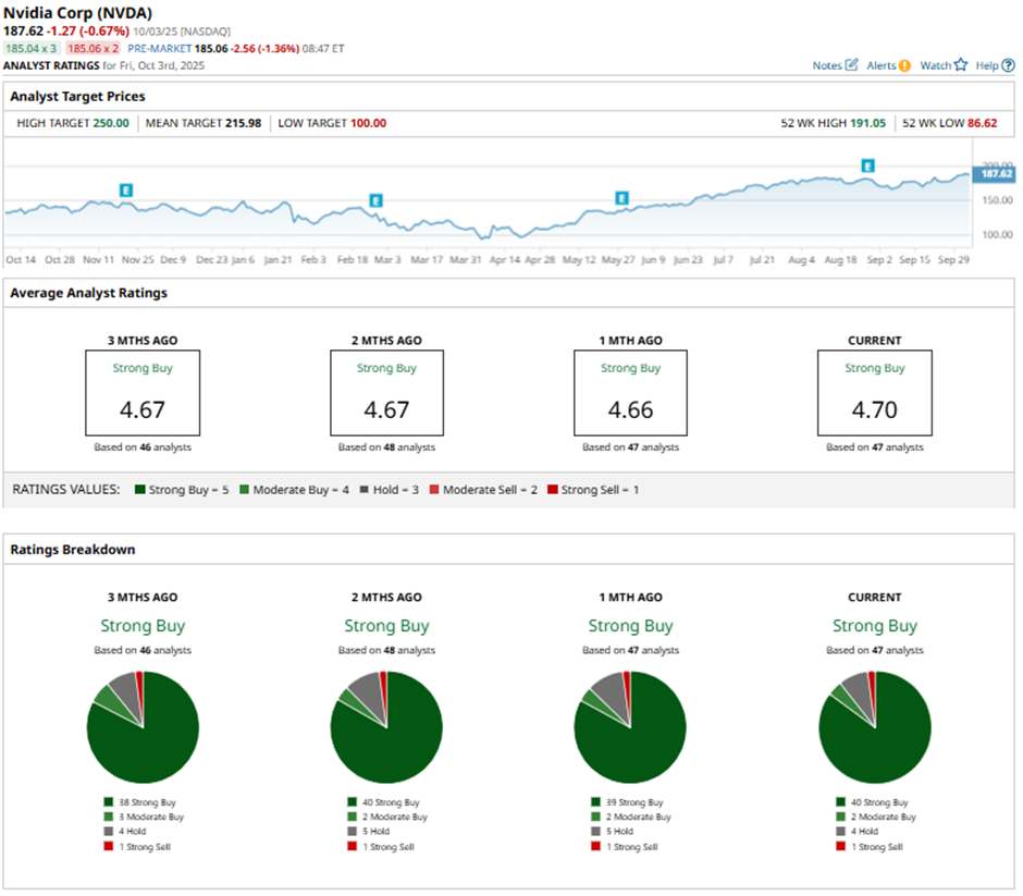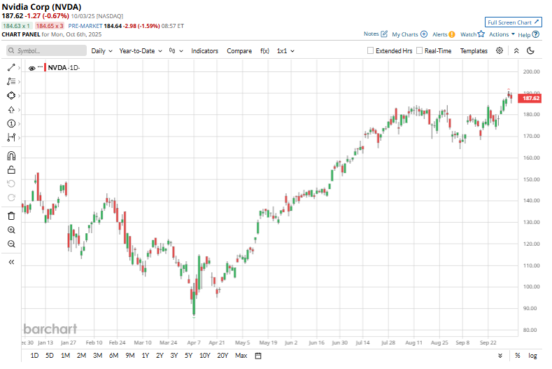 Over the past year, NVDA stock has delivered a strong performance, climbing by 36%. Year-to-date (YTD), the stock has continued to show upward momentum, outperforming broad market indices as investors double down on AI bets. The stock has gained a little over 36% YTD, compared to the S&P 500 Index’s ($SPX) 11% returns. NVDA stock reached a fresh 52-week high of $195.62 on Oct. 10, reflecting market confidence in Nvidia's AI growth narrative and reinforcing its status as a high-conviction tech holding. Despite some occasional pullbacks, the overall trend has remained decidedly bullish.