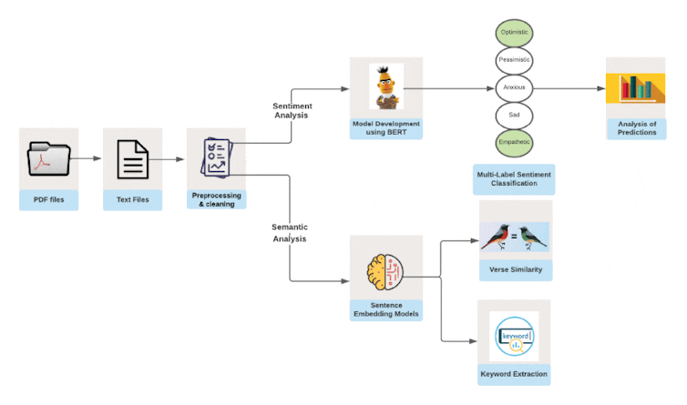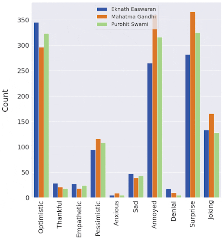 One limitation of our model is that it was trained on data from Twitter, so it recognises “joking” as a common sentiment. It applies this label inappropriately to some parts of the Bhagavad Gita. Humour is complicated and strongly culturally constrained, and understanding it is too much to ask of our model at this stage.