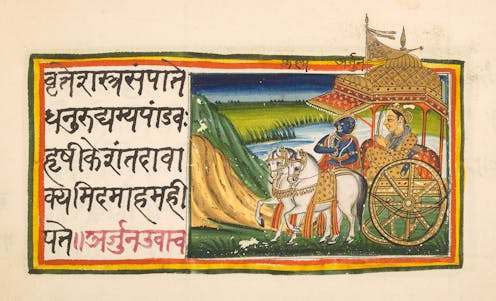 The text of the Bhagavad Gita relates a conversation between the Hindu deity Lord Krishna and a prince called Arjuna. They discuss whether a soldier should go to war for ethics and duty (or “dharma”) if they have close friends or family on the opposing side.