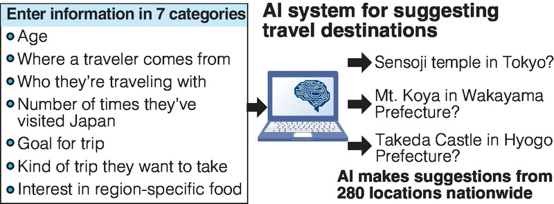 Those using the AI system during the trial will provide answers on seven points, such as their age and the goal of their travel, via the WOW U website. The system will then suggest multiple options from among 280 sightseeing spots from Hokkaido to Okinawa.