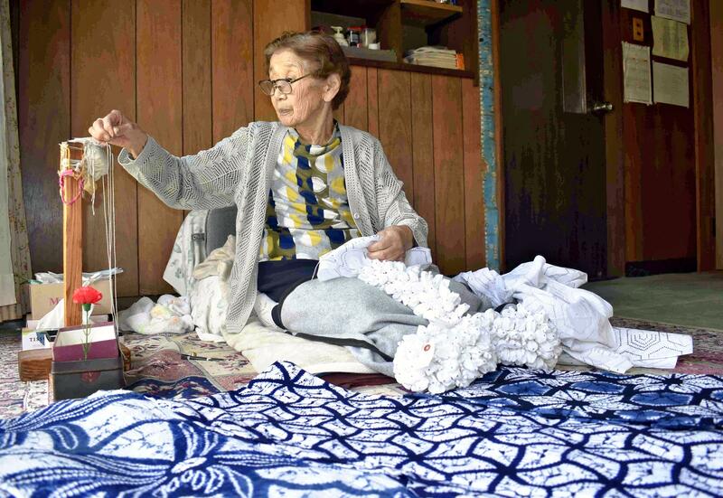 KARIYA, Aichi -- A 91-year-old woman in Kariya, Aichi Prefecture, works for five to eight hours every day in her home studio as an Arimatsu Shibori tie-dye artisan, practicing a skill that is recognized by the government as a traditional craft.