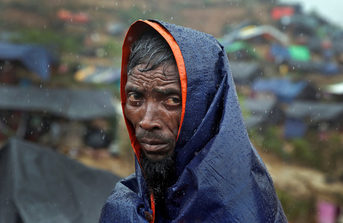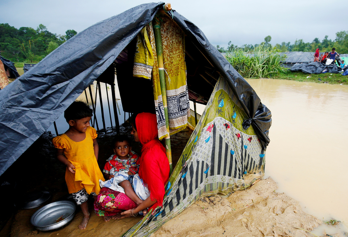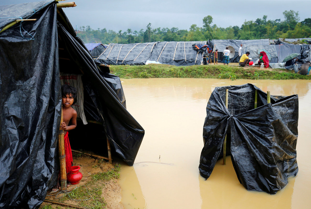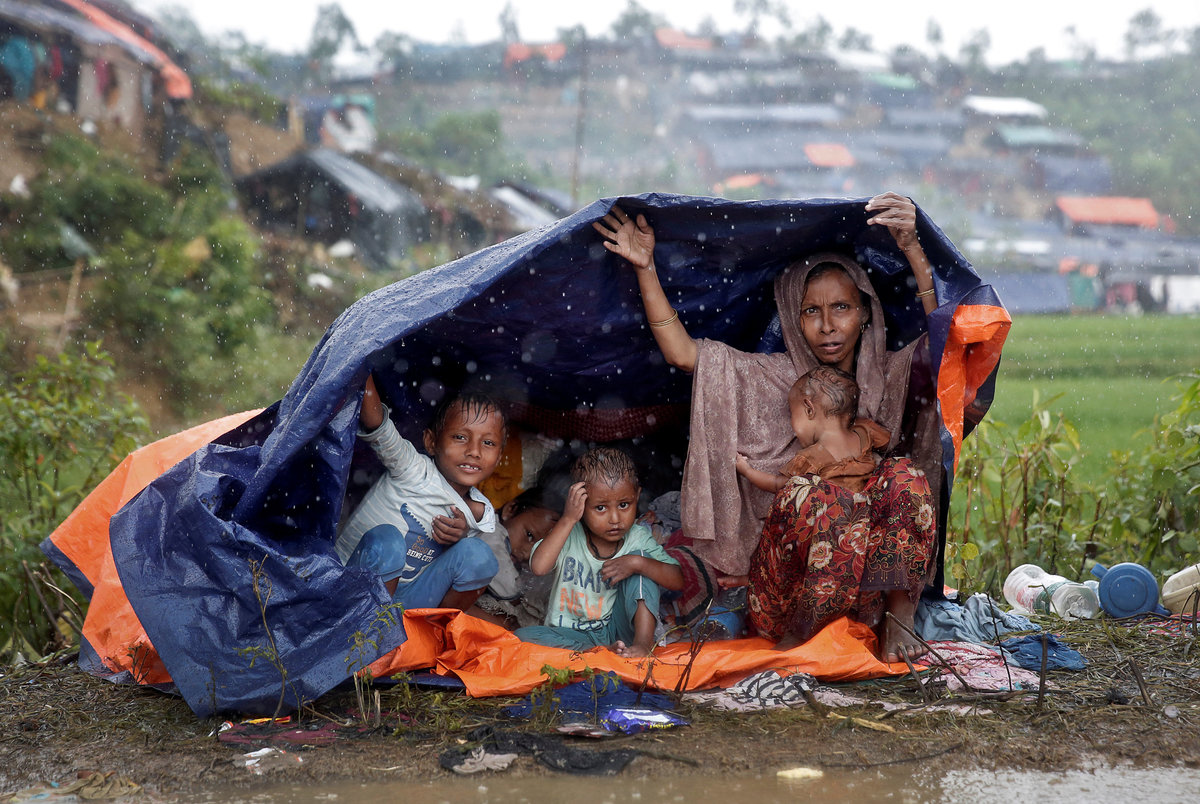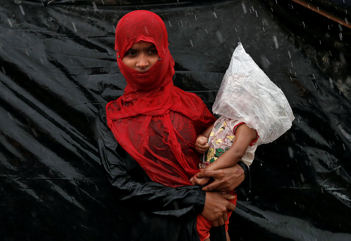 Heavy rain has turned roads into mud, with refugees huddling under shelters of bamboo and plastic sheets beside them.